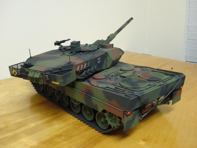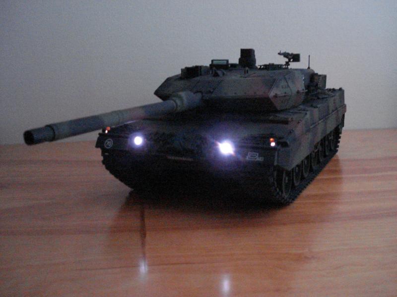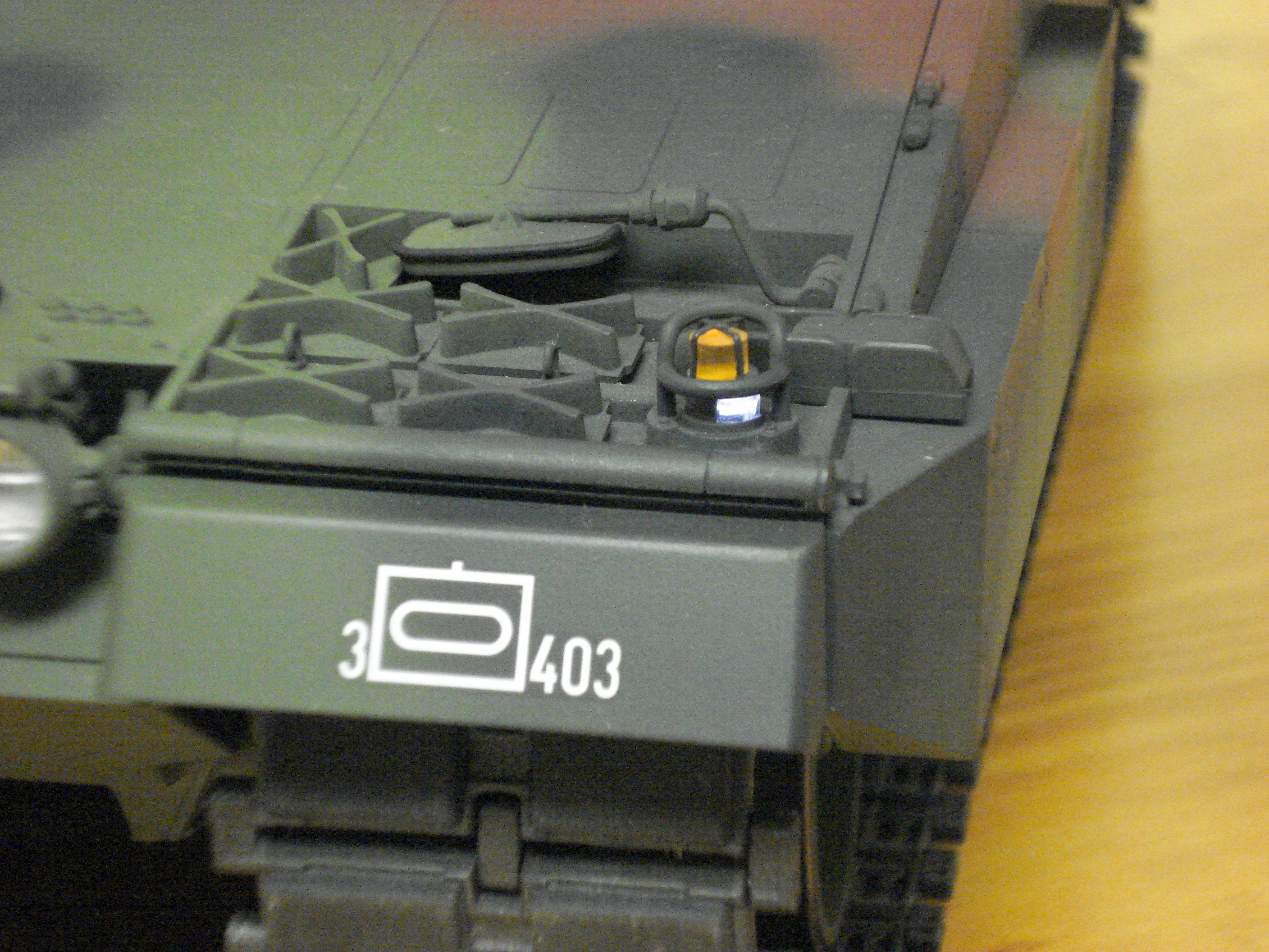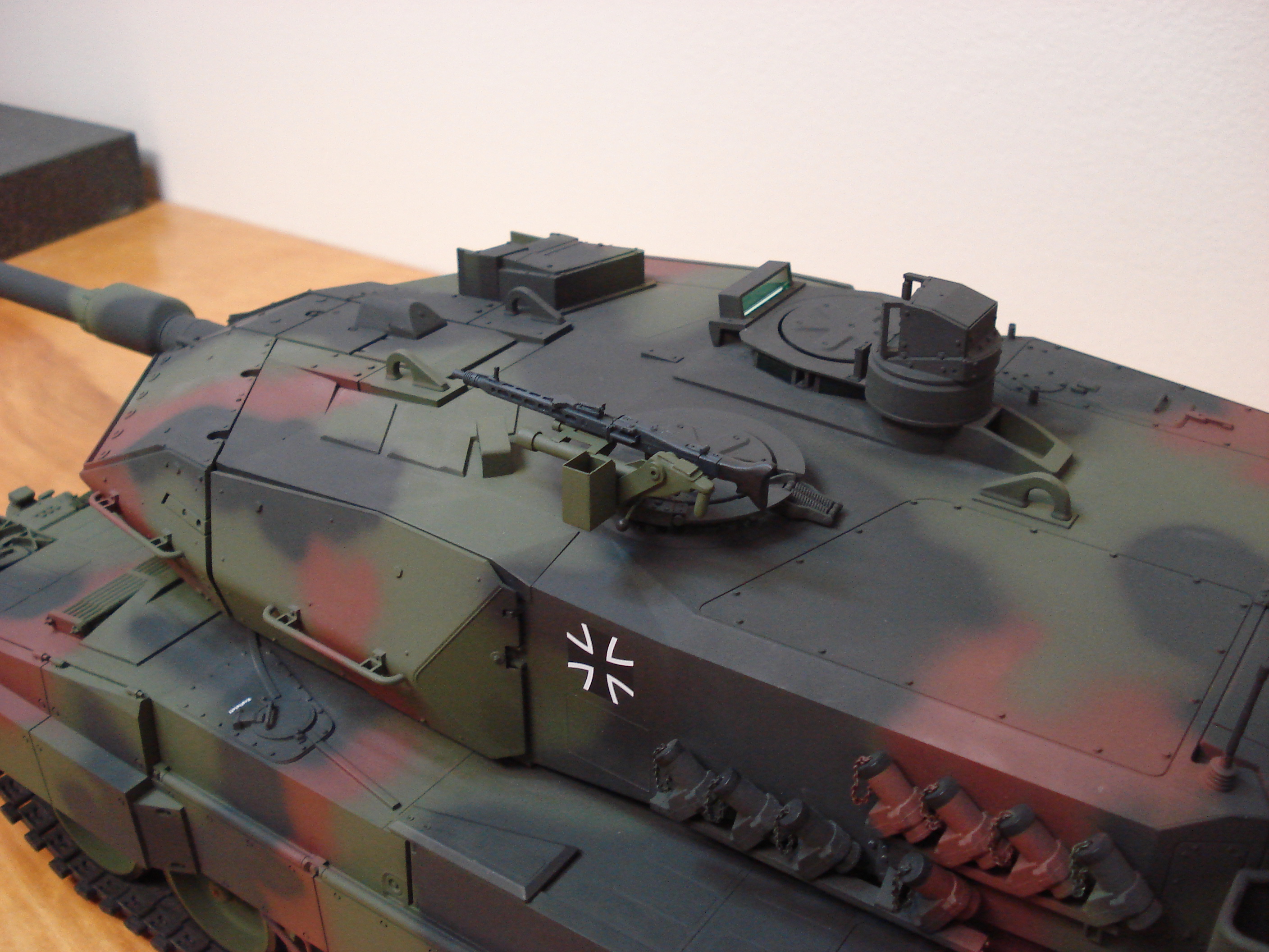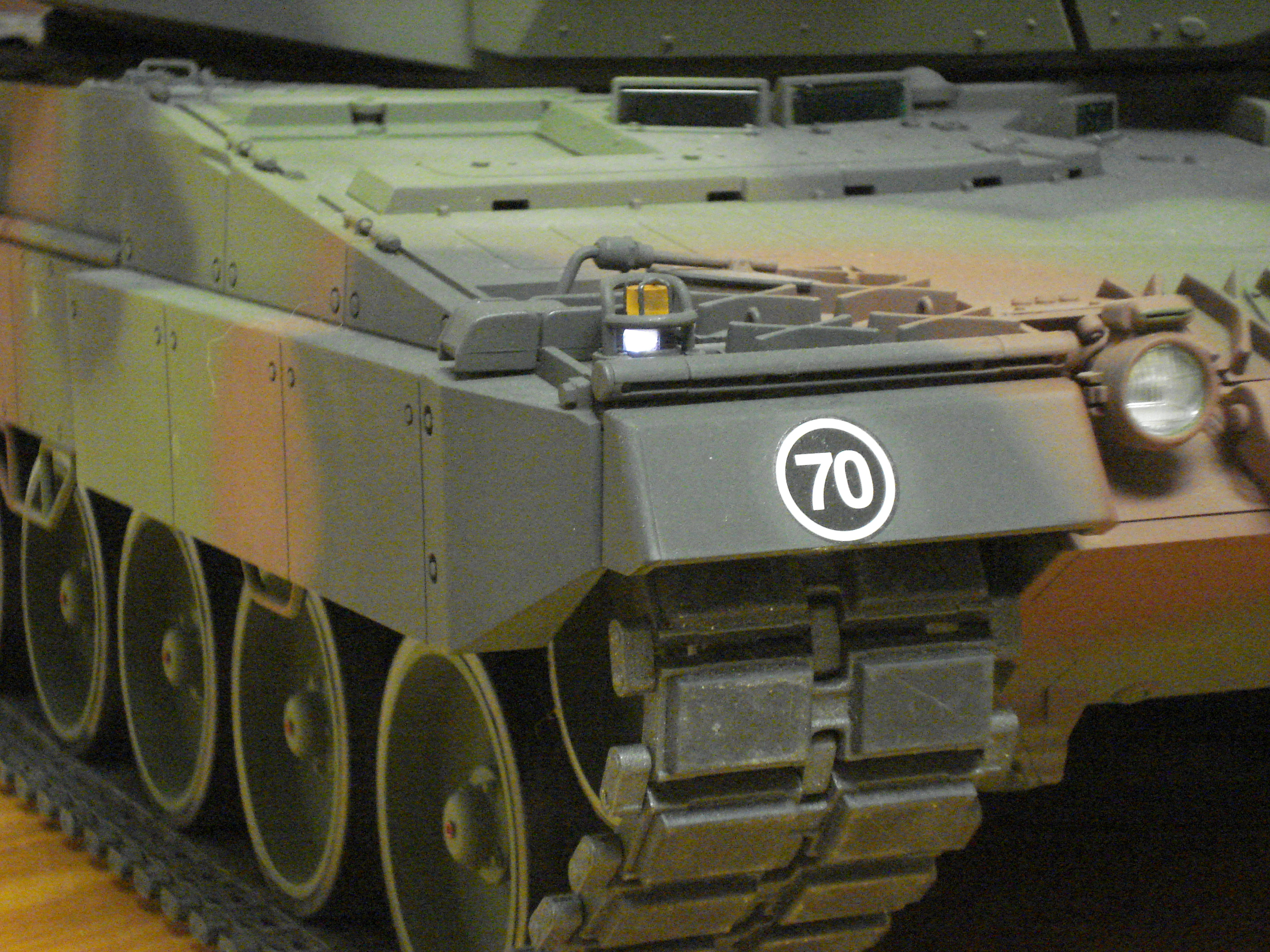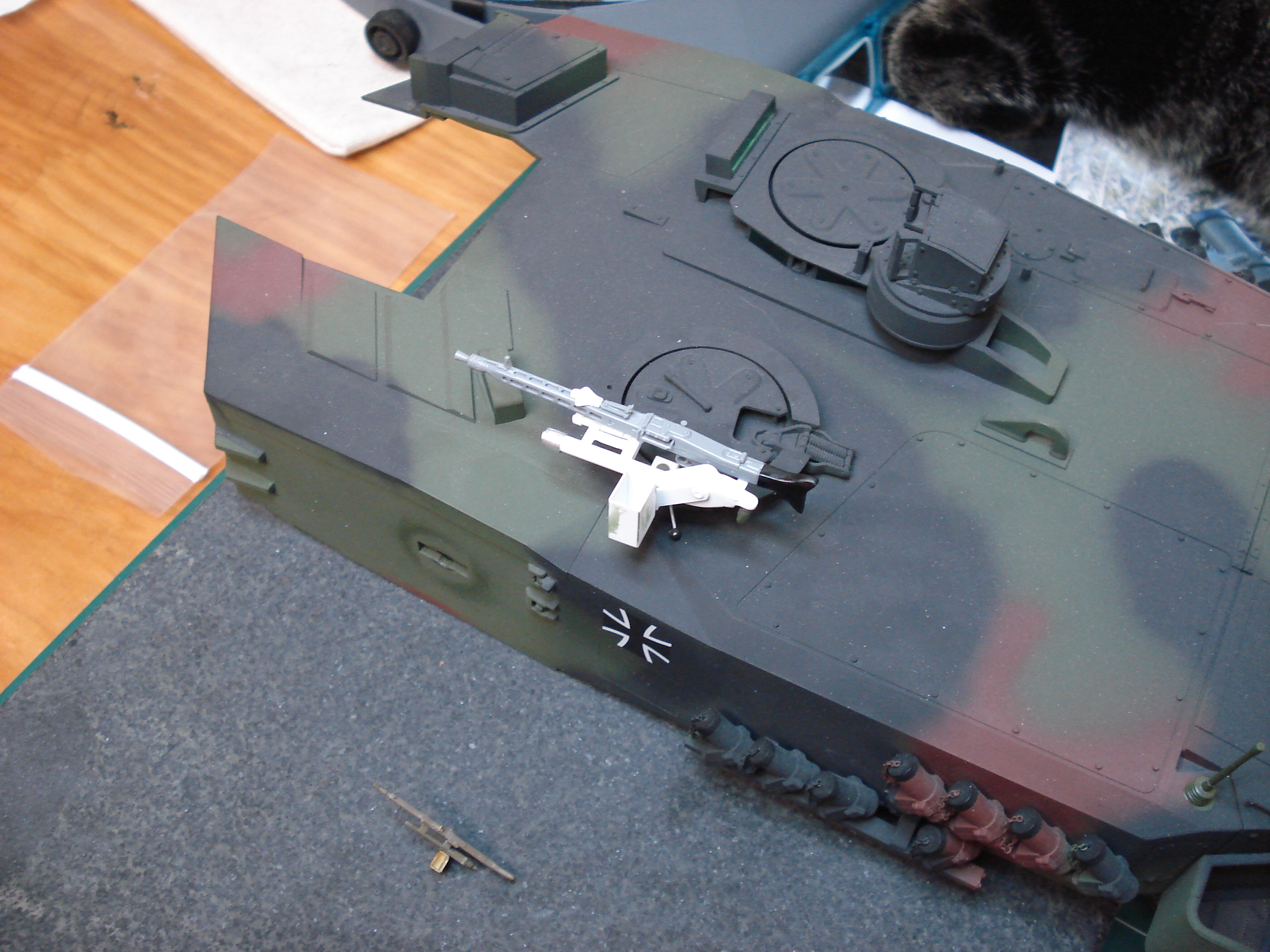 I have completed some modifications to my Tamiya Leopard 2A6. The following were added: 1. amber running lights in place of the painted kit originals. A craftsman in Germany (I believe on this site) has recently modeled the blinker feature of the lights which I admire very much. 2. The Flugabwehr MG 3. I bought more than one of the metal (pewter) kits from reputable sources but both were too heavy, and of poor quality. I almost bought the kit from AFV-Model as it looks to be of high quality, but I decided to scratch build the mount and used the MG42 from the Tamiya kit ITEM 36307. The final mod was the Rearview Camera antenna. Please excuse if I have some trouble posting the photos. Vielen Dank.