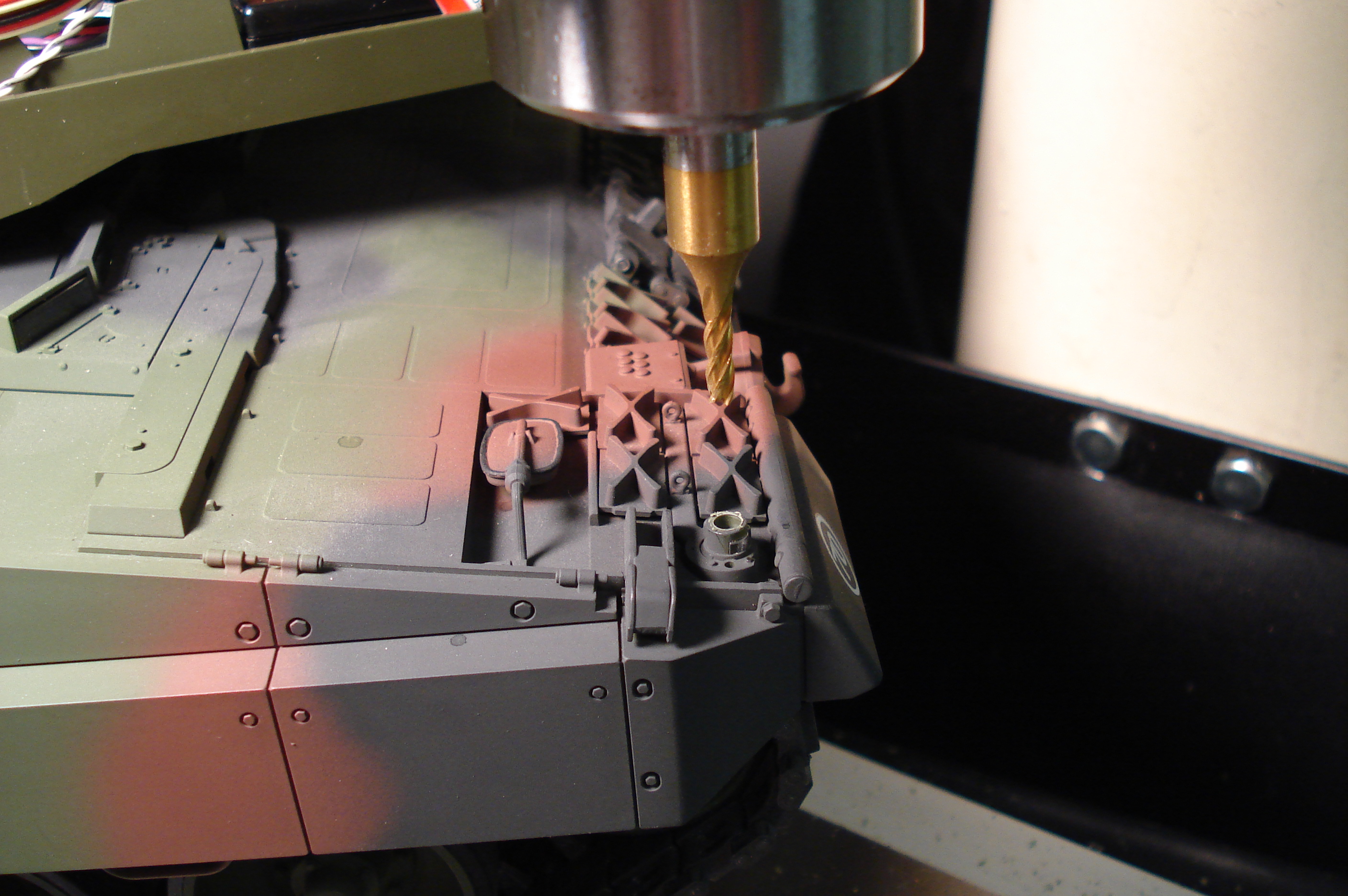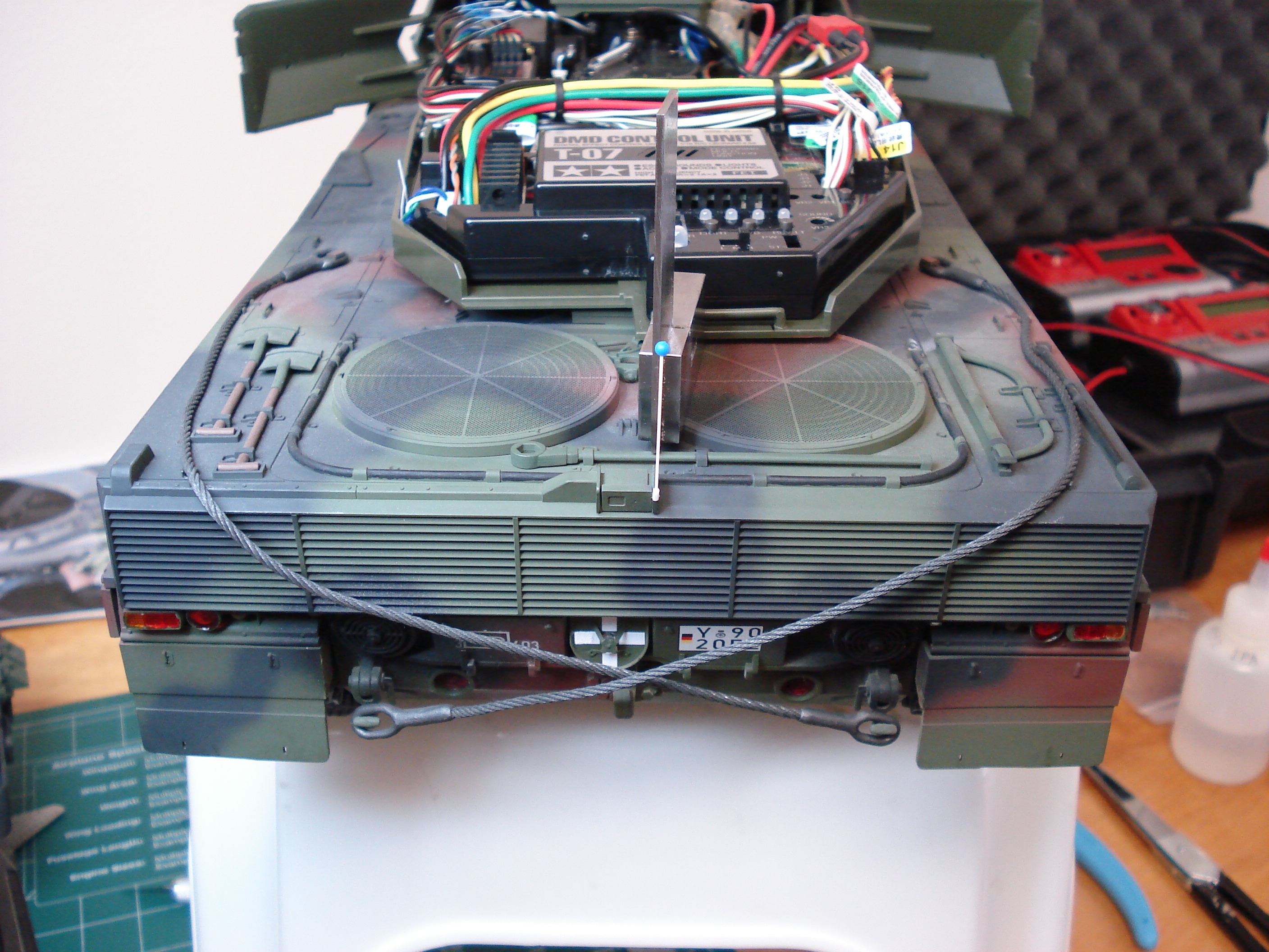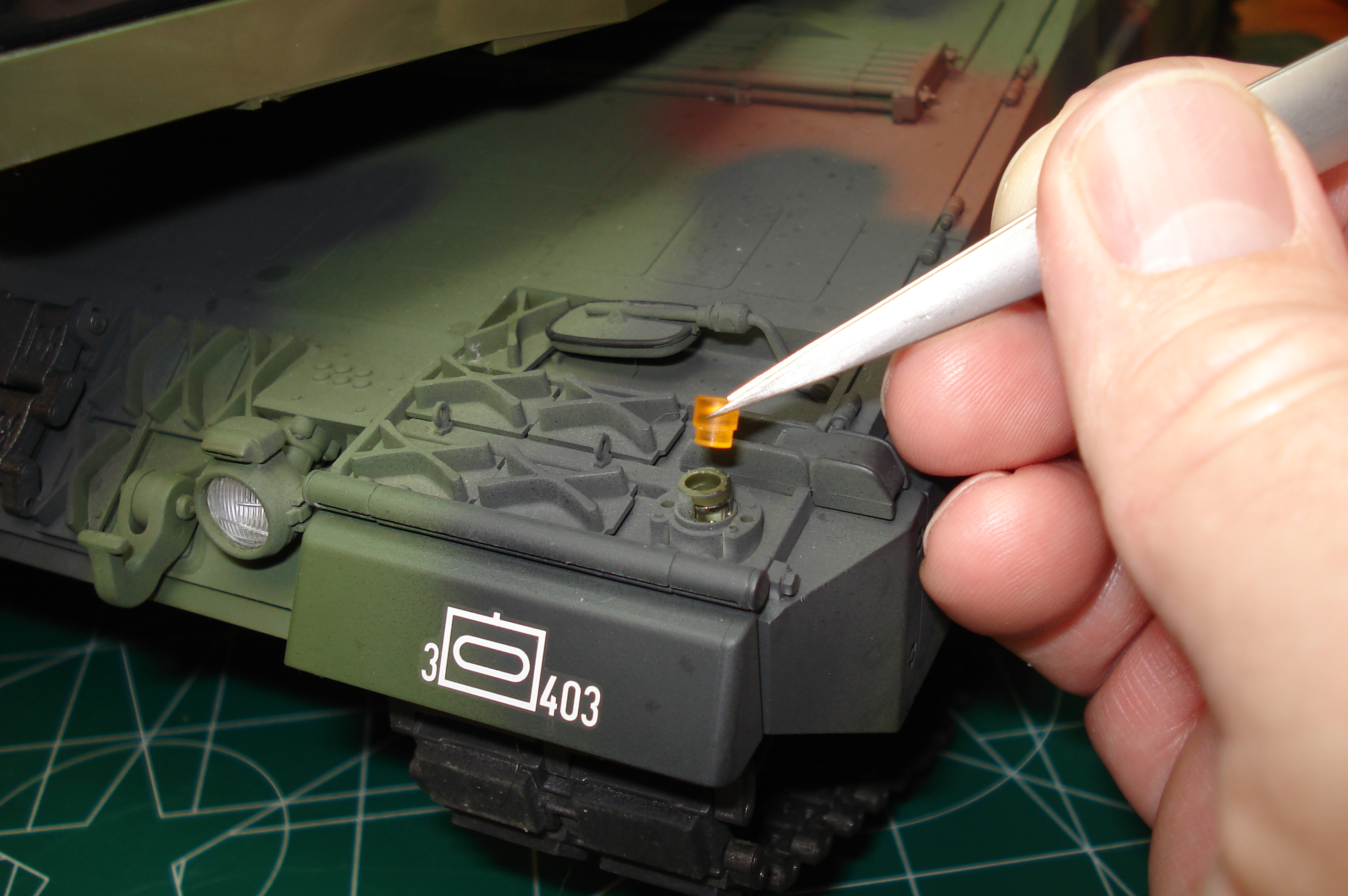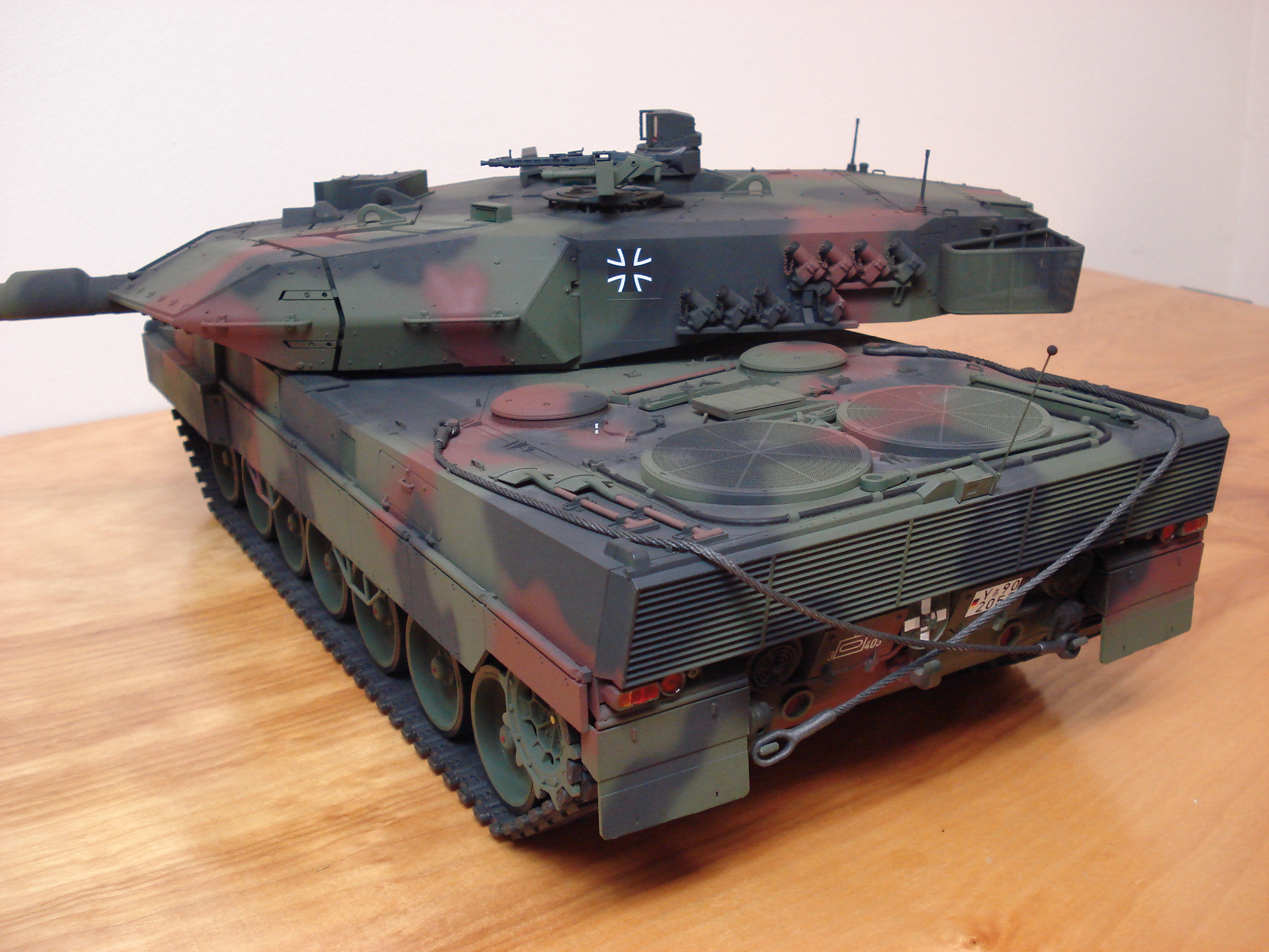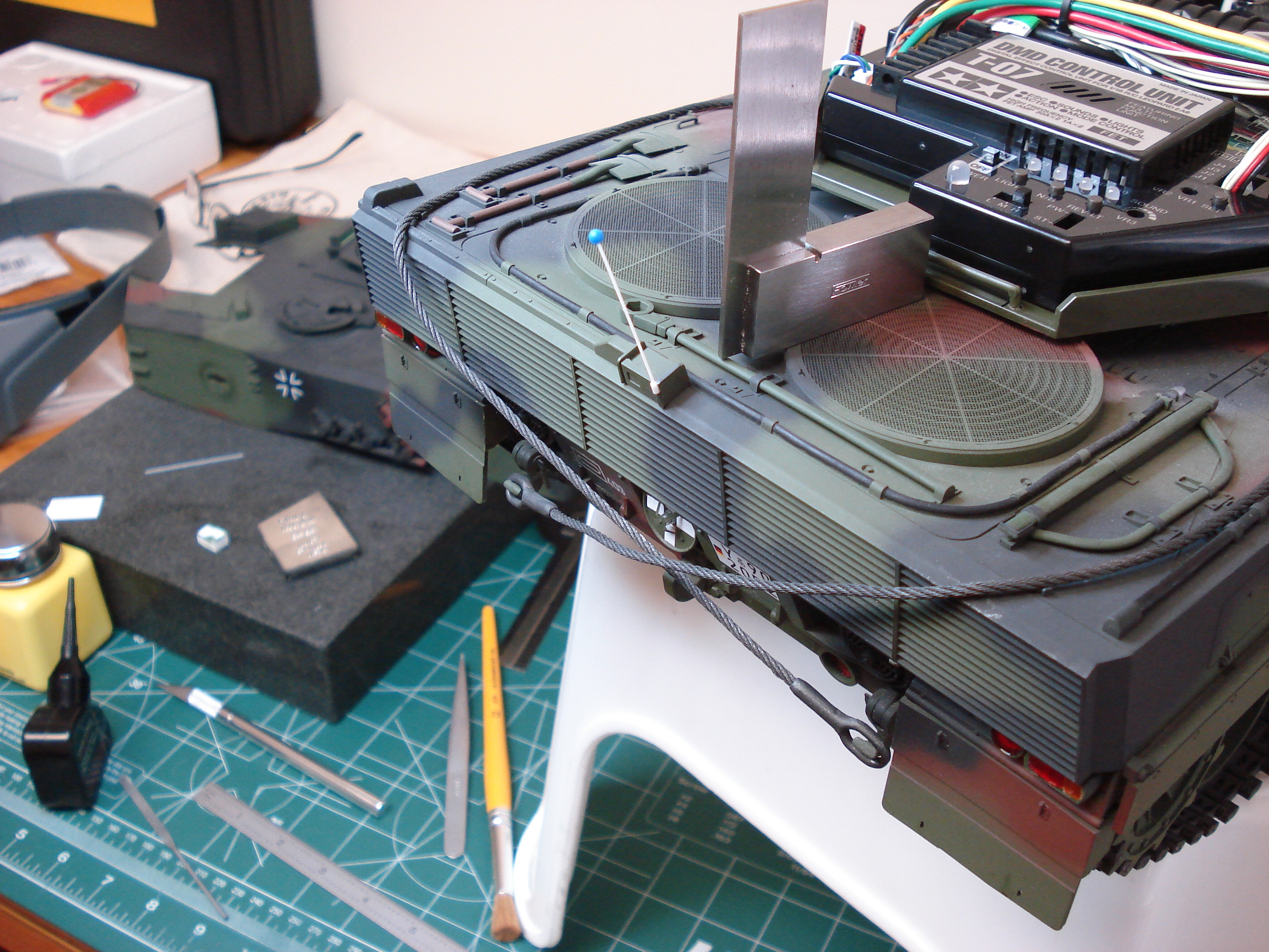 I have completed some modifications to my Tamiya Leopard 2A6. The following were added: 1. amber running lights in place of the painted kit originals. A craftsman in Germany (I believe on this site) has recently modeled the blinker feature of the lights which I admire very much. 2. The Flugabwehr MG 3. I bought more than one of the metal (pewter) kits from reputable sources but both were too heavy, and of poor quality. I almost bought the kit from AFV-Model as it looks to be of high quality, but I decided to scratch build the mount and used the MG42 from the Tamiya kit ITEM 36307. The final mod was the Rearview Camera antenna. Please excuse if I have some trouble posting the photos. Vielen Dank.