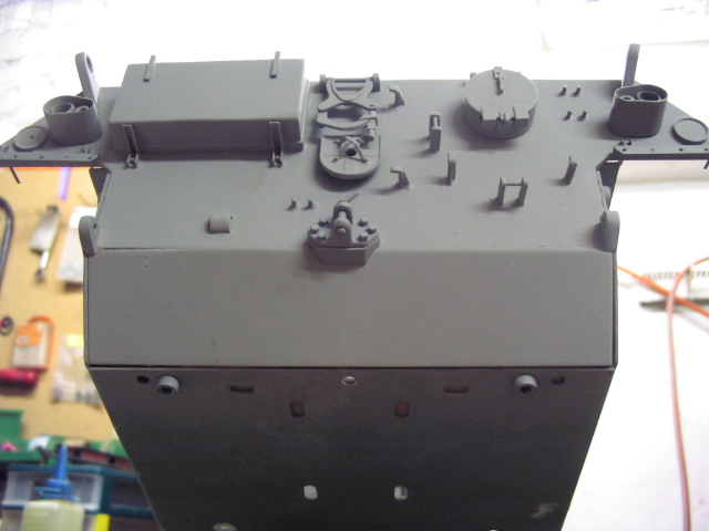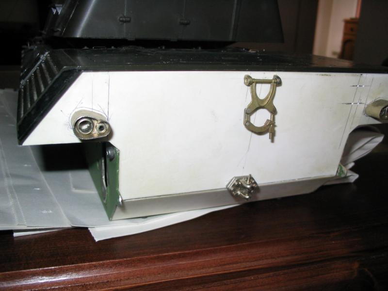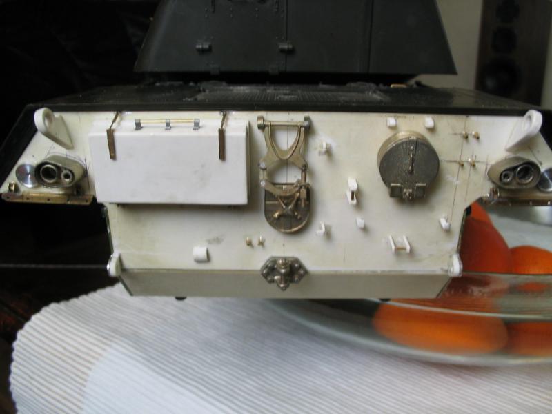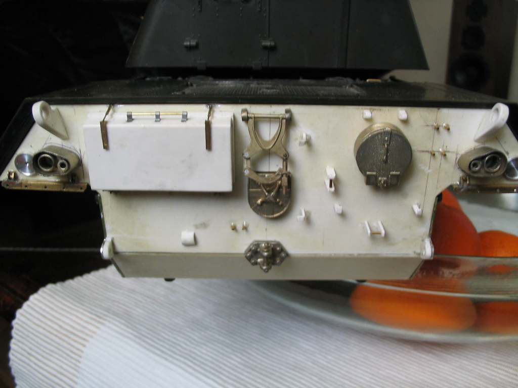 ich hatte den Leo oder besser gesagt die paar Leo Teile ohne der kompl. Rückwand erworben. Ich habe erst ein Stück Aluminium in Form geschnitten und zurecht gekantet danach habe ich 2 weiße Polyesterplatten zurechtgeschnitten und angeklebt . Danach die Ersatzteile nach Bildvorlage (orig.) an der entsprechende stelle angebracht. Hier mal ein Bild:
