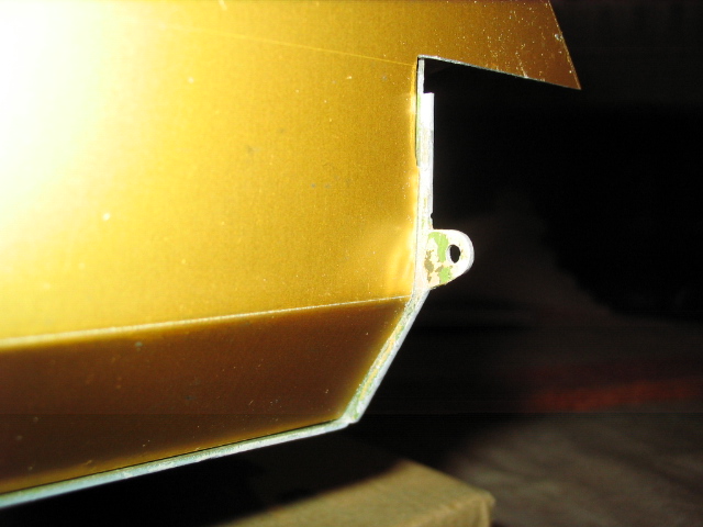 hier ein Bild von der Rückwand, du mußt sie in position schieben fixieren und dann die Löcher für die Schrauben bohren. Auf diesem Bild kannst du erkennen das die Alurückwand ca. 1,5 - 2 mm von der Aluwanne zurückgesetzt ist damit die Polyplatten nach dem aufkleben auf der Rückwand bündig mit der aluwanne ist.Ich hoffe du verstehst wie ich das meine.