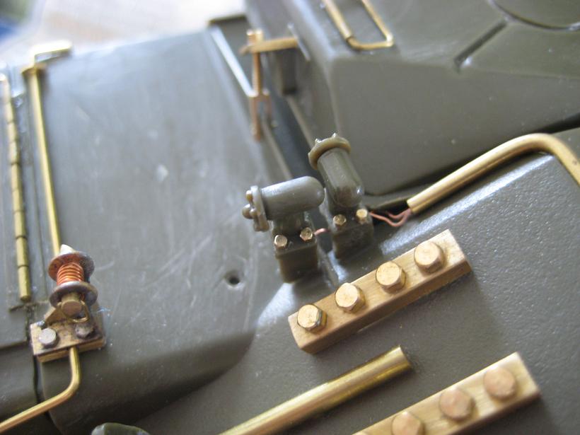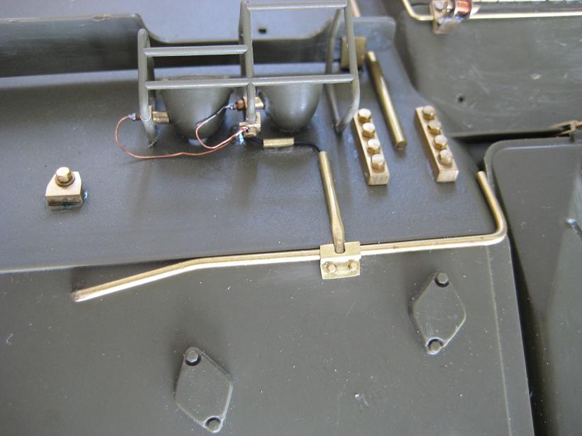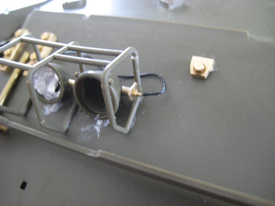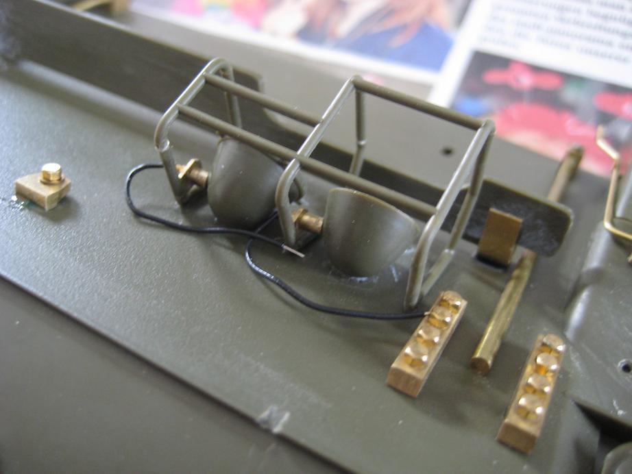 Bei mir geht es im Bereich der Scheinwerfer weiter. Ich weiche hier etwas von der Hoobenvariante ab, denn ich glaube, dass die Scheinwerfer immer an den Schutzbügeln angetackert waren.