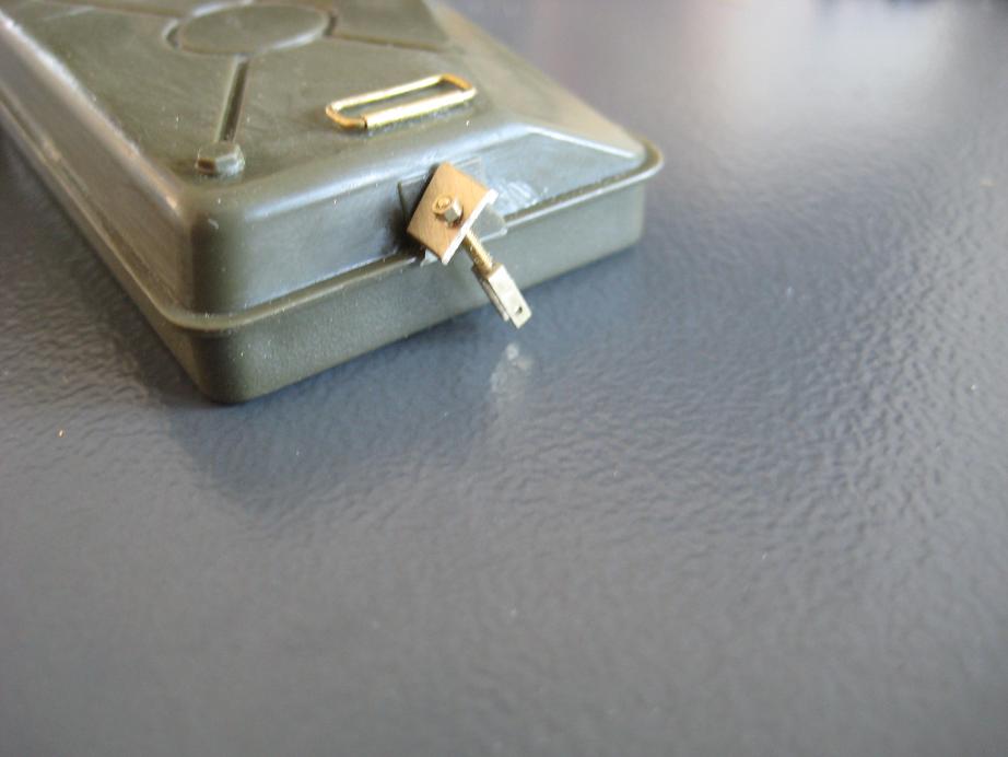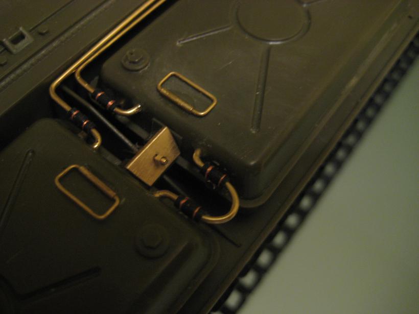 Und hier der Nachbau. Für die Gummimuffen habe ich Kabelisolierung verwendet. Ich denke, dass es maßstäblich einigermaßen passt. Auch habe ich die unterschiedliche Leitungsdicke am vorderen Tank berücksichtigt. Leider kann man das nur schwer feststellen. Auch kann man die kleinen Verschlussschrauben nicht mehr erkennen. Aber das war ja beim Original auch so.