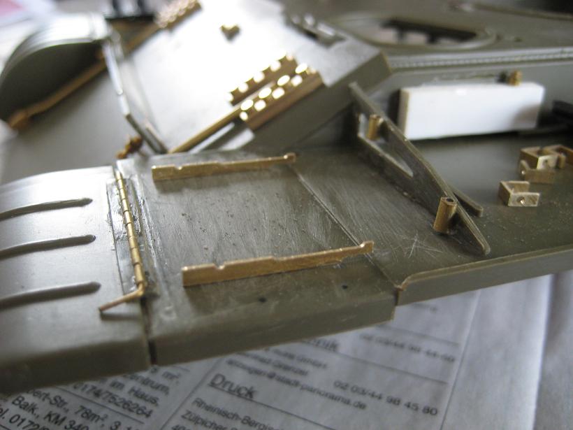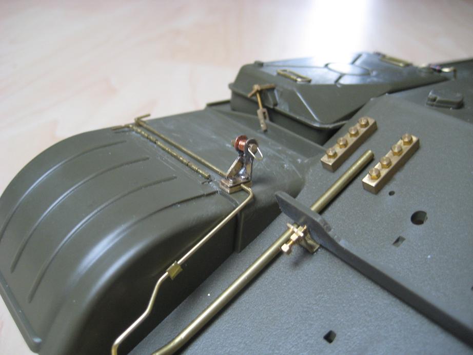Weiter ging es mit den kleinen Dingern welche rund um den Panzer verteilt sind. Entgegen der Bauanleitung habe ich sie auf der rechten Seite nicht miteinander verklebt, sondern eine vor dem Stegblech und eine hinter dem Stegblech angebracht. Auf den Vorlagefotos ist es immer so zu ersehen. Die alte Hoobenposition ist durch die Bohrung gekennzeichnet. Den Platz benötige ich außerdem für die Halterungen der Ersatzkettenglieder.