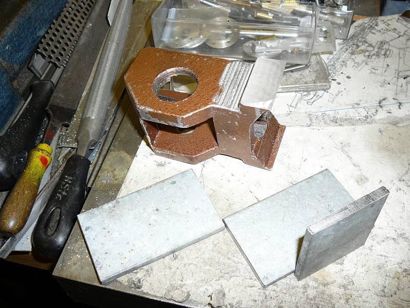Wie nun leicht zu ersehen ist, wollte ich die gebrochenen Augen ( passendes Wortspiel ) durch Stahlteile mit einem Mehrfachen an Festigkeit ersetzen. Hier boten sich Platten aus Flachstahl an und ich suchte mir aus den vorhandenen Resten in meiner Schweißwerkstatt ( Garage ) das Passende heraus: verzinktes Flachmaterial 50x5mm. Ziemlich genau richtig - 60x5 hätten besser gepaßt, aber man kann nicht alles haben.