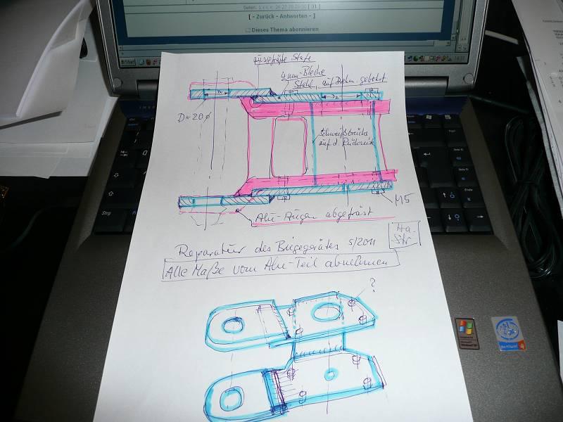 Im Verlauf der konkreten Überlegungen zum sinnvollen Vorgehen machte ich mir erst einmal, wie bei mir üblich, eine Handskizze. Die habe ich schon mal im Thread für "Das andere Kettenfahrzeug" gezeigt, aber der Vollständigkeit dieses Berichtes halber muß das Bild hier auch erscheinen. Daran wird nämlich sehr schnell alles klar, so dass kaum noch Fragen offen bleiben. Der Rest wird dann durch die folgenden Bilder erklärt. -- Gruß Hartmut