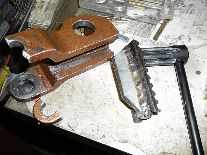 Man sieht, dass ich die etwas zu schwache Andrückplatte ( Zahnstange ) bereits mit einer Versteifungsrippe versehen hatte, denn das Ding war eigentlich ein Konstruktionsfehler, weil die eingefräste Verzahnung die Platte gegen Verbiegen am freien Ende ( ohne die Führung, kurz vor dem Biegedorn ) empfindlich machte.