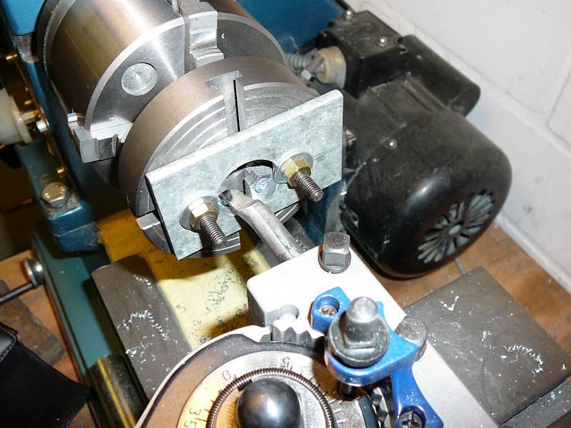 Zum Anschluß an das Thema noch einmal die Planscheibe ( von EMCO "Unimat 3" mit einem stählernen Hals zum Einspannen versehen ), die mir das Herausarbeiten der großen Bohrungen auf der Drehmaschine erlaubt.