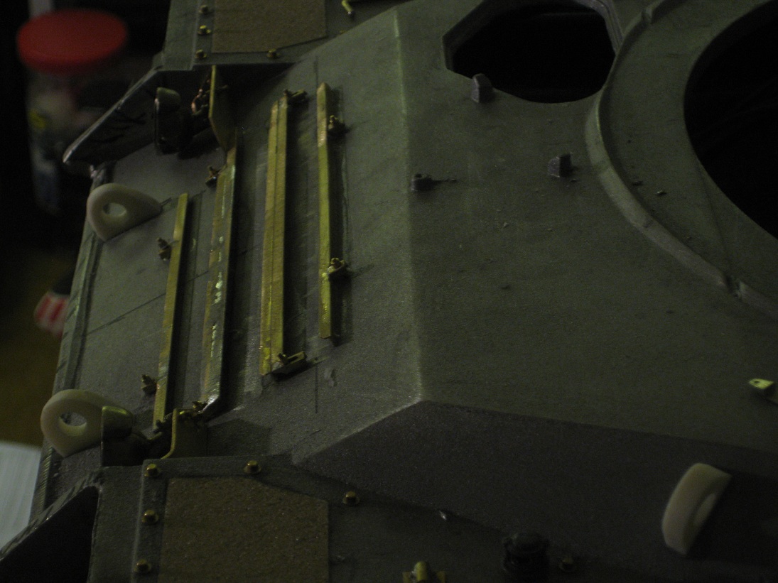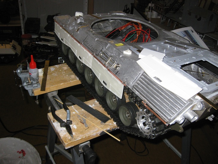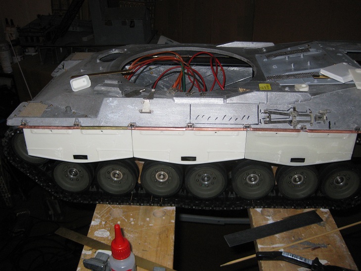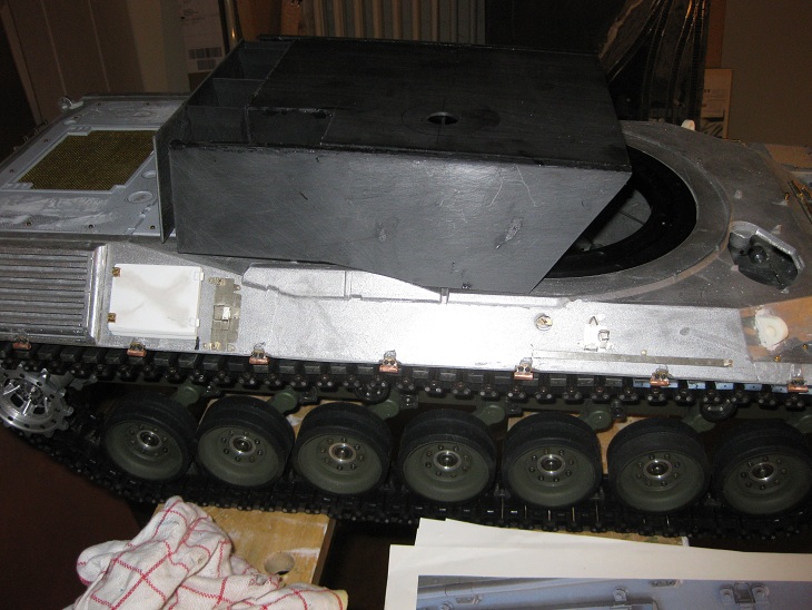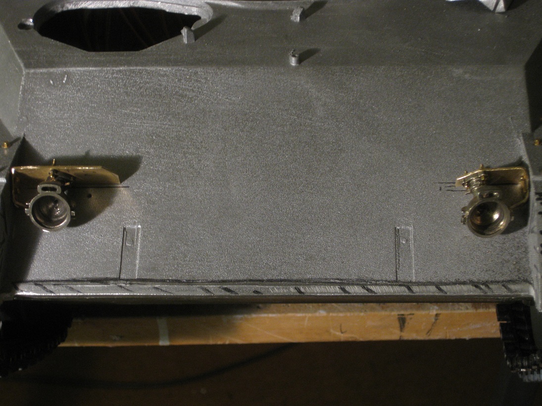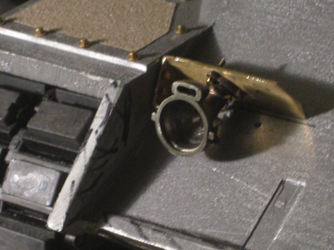 Die Schürzen sind jetzt für beide Seiten abgegossen und teilweise montiert (Probeweise). Fehlen noch die Verschlüsse und Kleinkram der Schürzen. Dazu hab ich mal mit den Frontscheinwerfern begonnen. Diese sind von AFV (Leo2). Spricht etwas gegen die Leo2 Scheinwerfer?