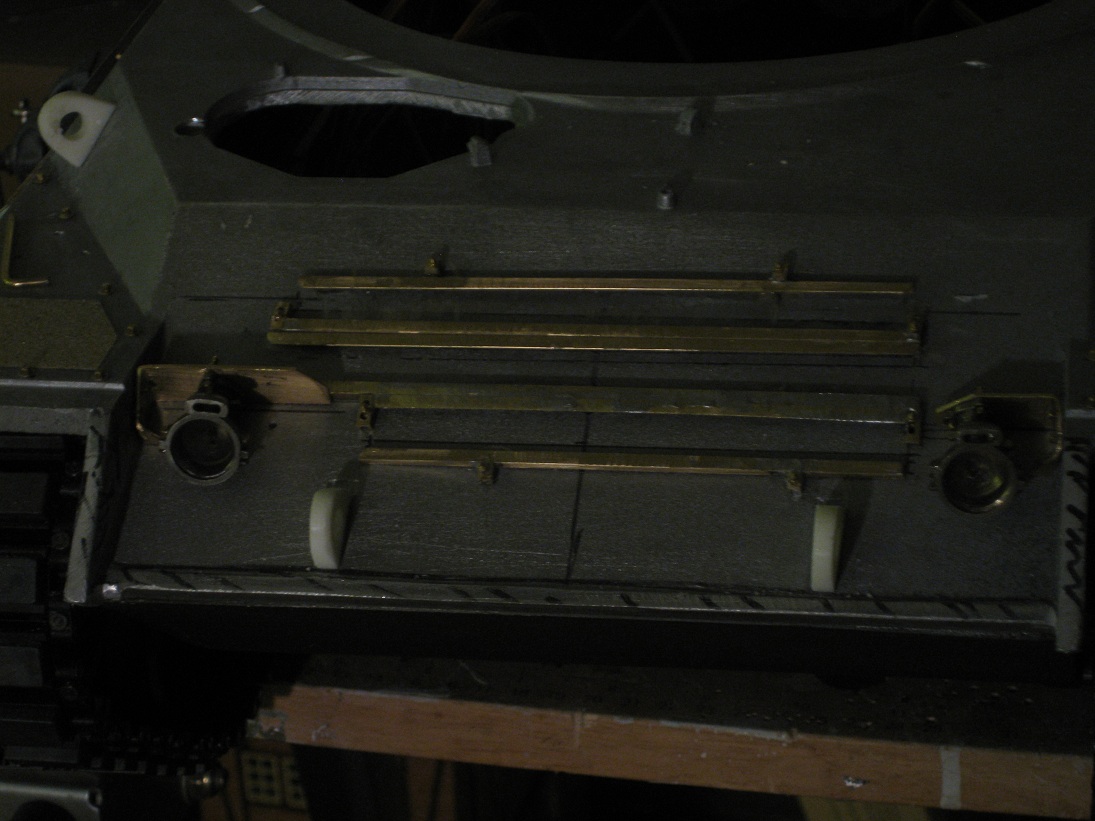 Das hab ich völlig unterschätzt- die trivialen Halter der Eisgreifer. Erstes Problem- Material über deren genaue Gestaltung- sprich Längen etc.... jeder Abschnitt ist anders. Zweites Problem- das anlöten der kleinen (5/ 8 mm) Stücke durch die die Befestigungsbolzen/ Schrauben kommen.... die Flüche wiederhol ich mal nicht... dritte Hürde: einkleben der Bolzen in die Wanne, aufdrehen der M1,4 Muttern mit dem "2er" Schlüssel! Im Original wohl M19 oder 20, hinter M1,4 mit 2mm Kopf! Ich glaub, ich werd zu alt für sowas. 1:10 ist richtig ernsthaft betrieben anstrengender als 1:16. Dort wär das das ankleben einer fertig gespritzten Platte gewesen. 2 Minuten. Hier: 1 Woche Feierabende, gefühlt eine Ewigkeit......