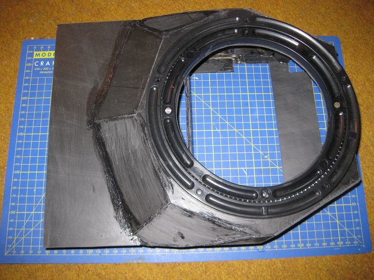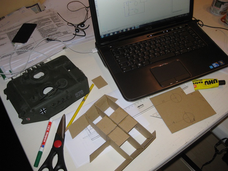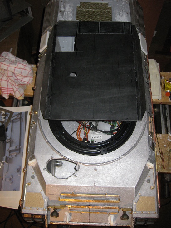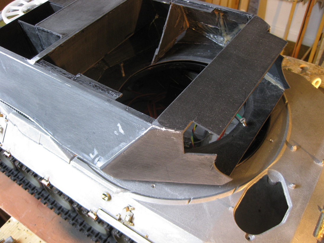 Ich habe mit dem Turm begonnen. Hochskaliert vom Tamiya Turm. Ist doch nicht so trivial wie ich dachte. Erst nachdem ich in die Innenseite des tamiya Turmes "Spanten" aus Pappe reingebastelt habe hab ich das so langsam mit den Winkeln etc. hinbekommen. Schaut ihr.