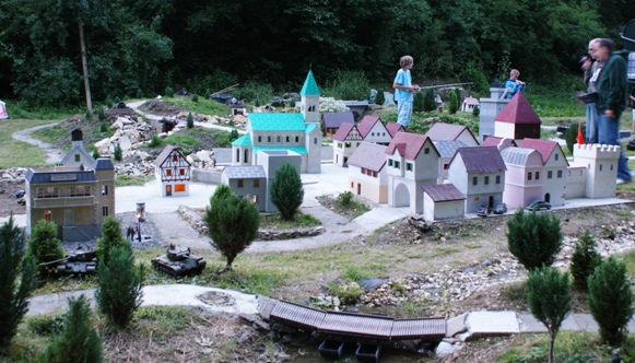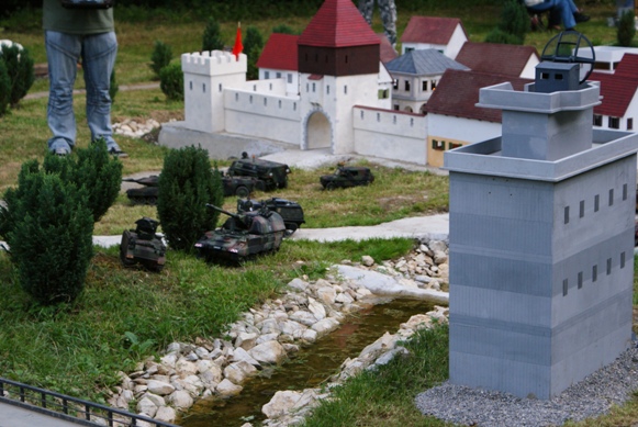 Das Panzer-Fahrgelände ist kleinteilig, nur für 1:16 geeignet. Die Häuser sind noch leicht kleiner im Maßstab, sie wären sonst zu klobig. Das richtige Größenverhältnis ist die Kunst.