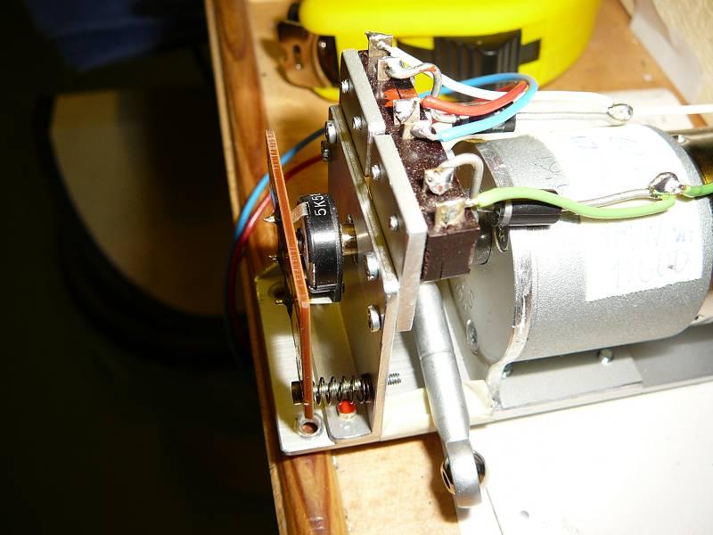 die Poti-Platine ist nur an einer(!) Schraube lose befestigt, damit sie die unvermeidlichen leichten Bewegungen des Potis auf der Getriebe-Achse mit macht - sonst klemmt´s. In dem Poti steckt als Mitnehmer ein speziell geformtes Drehteil, das genau den Hohlraum dort ausfüllt und mit dem (Arbeits-) Hebel verlötet ist. Eine zentrale Schraube M2 hält das Poti fest. Das ist leider nicht zu erkennen. -- Gruß Hartmut