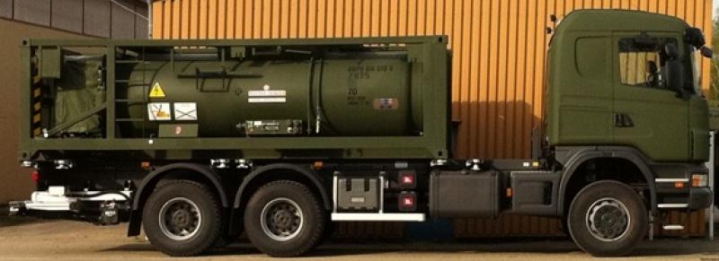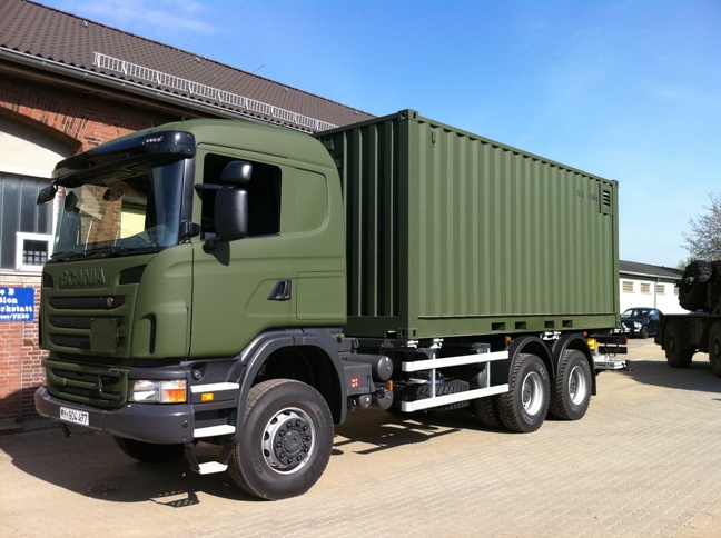 Ist halt ein ganz normaler LKW, außer, dass man den Container wechseln kann. Das könnte zur Versorgung im Einsatz wohl von Vorteil sein, da kann man gleich einen Container ohne Umladen vom Schiff zur Versorgung nutzen...