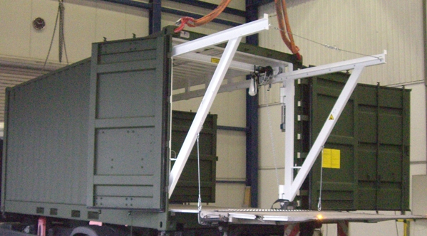 Ebenso wie der Container. Der auf den Bildern verladene 20 Fuß-Container ist von der Fa. CHS Spezialcontainerbau aus Bremen. Es ist ein Sidedoor Container mit einem innenliegenden 1 t Kran, der Lasten auch hinter dem Fahrzeug oder auf der Ladebordwand absetzen kann.