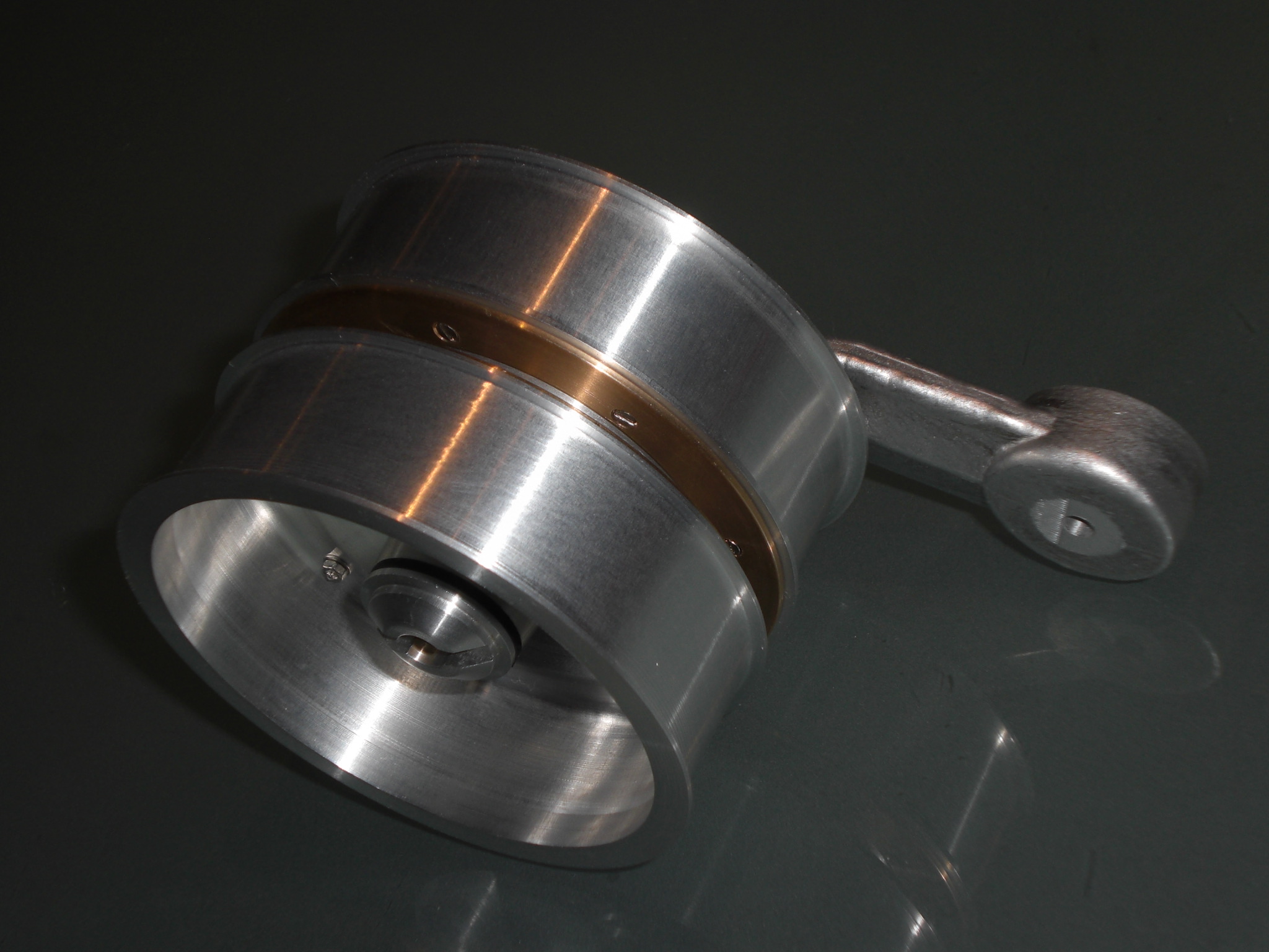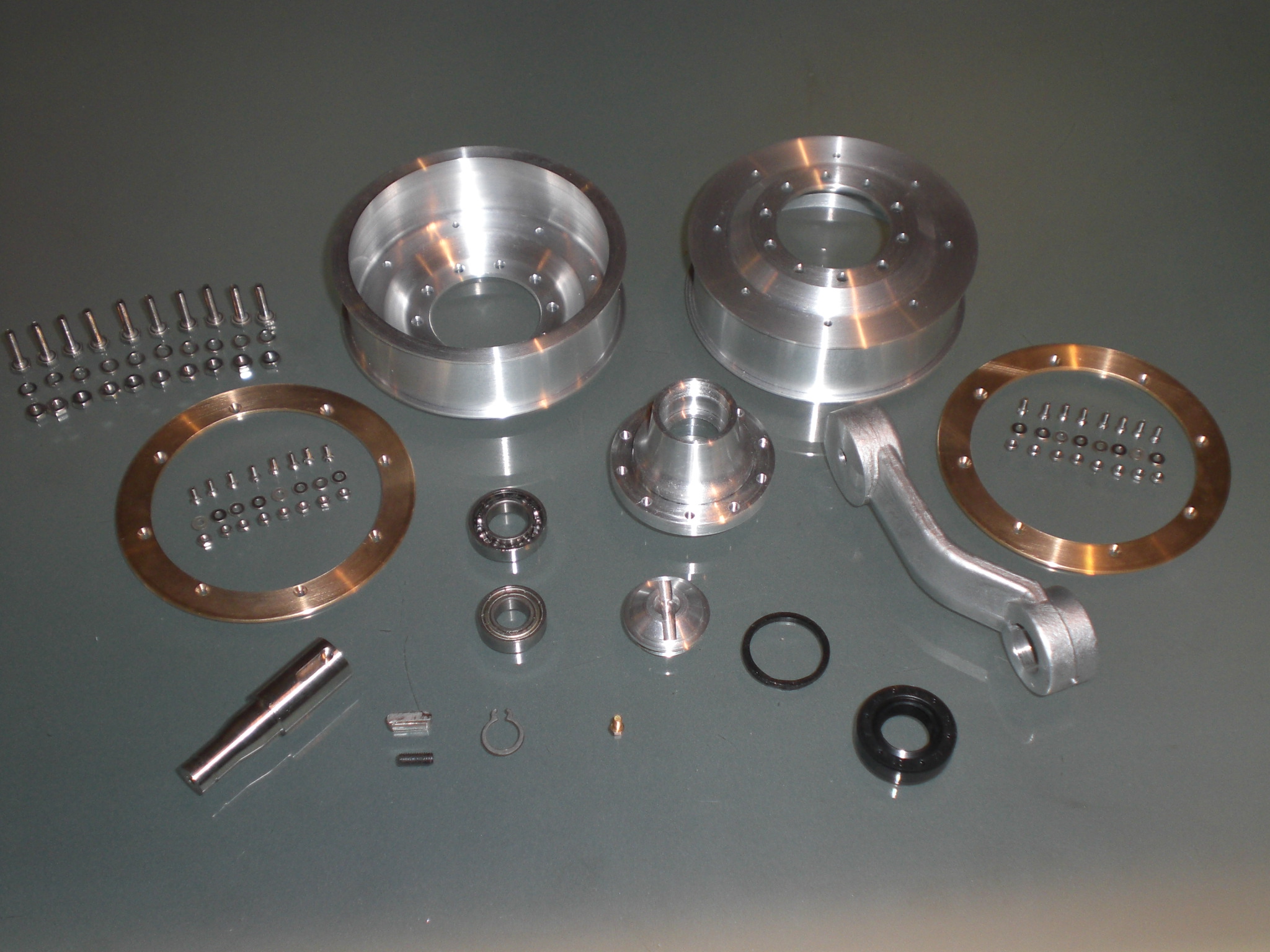 So nun noch ein Foto auf der die Laufrolleneinheit komplett miteinander montiert ist. Mit Hilfe des Radialwellendichtrings und der Abdeckkappe für die Laufrollennabe ist das innere komplett dicht und kann durch die M2 Schraube mit Öl gefüllt werden sodas die Kugellager ständig in einem Ölbad laufen und damit langsamer verschleißen. Es fehlen noch die Laufrollengummis die ich mit der Ebalta-Gießmasse fertigen möchte. Falls mir dazu einer einen Tipp geben könnte ob man das Zeug immer noch als Privatperson von Ebalta direkt beziehen kann, oder ob man nur noch als Gewerbetreibender da rankommt?!