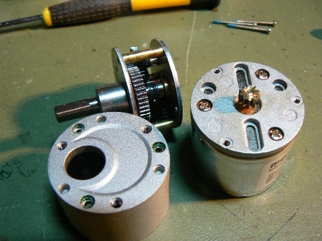 -- Das Getriebe....... hier muß gerechnet werden. Normal wären so am Kettenrad 400 U/min. Wenns etwas weniger ist sieht scaler aus. Auch muß der Zahnradhaufen möglichst kurz bauen und obendrein an den Motor passen. Bewährt haben sich die RB35-Antriebe 1:30 oder 1:50 (Reglersteuerung beachten, speziell SGS). Der dort verbaute Motor ist aber zu schlapp und fliegt aus dem Fenster. Nicht ohne vorher die Einbauhöhe des Motorritzels zu vermessen. Und abziehen muß man das Ritzel dann auch noch. Und nun wird klar warum der Motor oben verwendet wird. Das Ritzel des RB35 hat nämlich dummerweise nur 2mm statt der üblichen 2,3mm Durchmesser. Der Speed 300 Motor hat bereits diese Welle. Ein aufbohren des Ritzels entfällt somit. Wer keine Drehbank hat wird sich bedanken. Zusätzlich hat das RB35 Getriebe eine groß dimensionierte 6mm Abgangswelle und eine lange Buchse zur guten Ablagerung derselben. Es treten schließlich hohe Seitenkräfte auf.