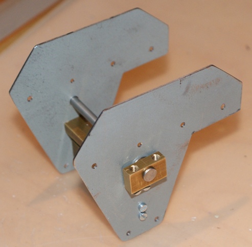 Das Federpaket ist ein Standard von Wedico, ich drehe es um, die Aufnahme ist aus Messing. Nett nicht? Die Stücken blieben übrig, weil ich mich bei den Verstärkungsstreben veremessen hatte und noch was absäbeln mußte. Ursprünglich hätte es Kunststoff sein sollen. Die Drehachse ist durchgängig, hat auf der einen Seite einen "Hut". Auf der anderen Seite wird sie im der Federaufnahme mit einer Inbusschraube geklemmt, so kann ich alles spielfrei und gängig einstellen.