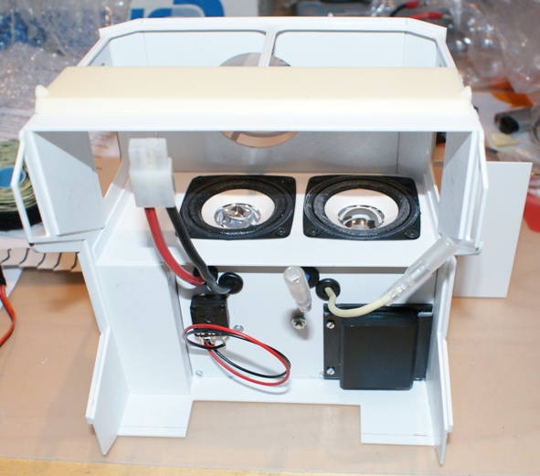 Hier der Blick von unten. Es fehlt noch der Boden im Fahrerhaus. Die beiden Lautsprecherchassis habe ich aus einem billigen Multimedia-Lautsprecherset geschlachtet. Ich könnte noch den zugehörigen Verstärker dazu nehmen, aber die Lautstärke scheint auch so zu reichen.