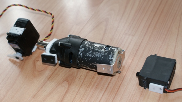 Um die Standardservos im schmalen 1:16er unter zu bekommen, mußte ich sie modifizieren. Die Befestigungslaschen habe ich gekappt und stattdessen seitlich Kunsstoffplanken angebracht, die mit Gewindebohrungen versehen sind. Eines der Servos muß gegenläufig arbeiten. Ich konnte mich erinnern, dass das Mercury-Lenkservo dies tut. Es wurde umgehend ausgebaut und muß mit seinen 6kg Stellkraft nun vorn Dienst tun.