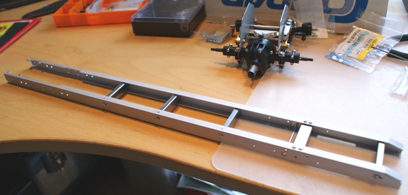 Nach der Kür mit der Elektrik mal wieder etwas von der Pflicht. Ohne Mechanik nutzt das ganze Strippen-Platinen-Brimborium nix. Ich mußte Antrieb und die beiden Lenkservos im Rahmen befestigen.
