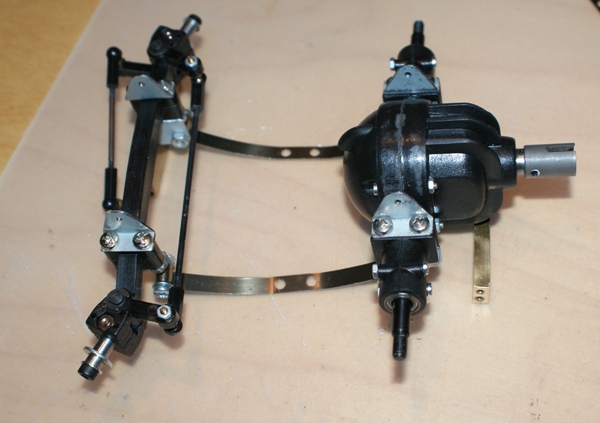 Erst beim Fertigen stellte ich fest, die Achsanschlüsse liegen bei der Lenkachse 2 mm tiefer als bei der Treibachse. Dies konnte ich über die Federaufnahmen ausgleichen, in Ruhe muß das Blattfederpaket schon waagerecht liegen.