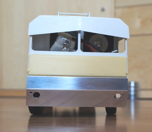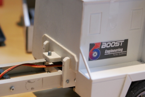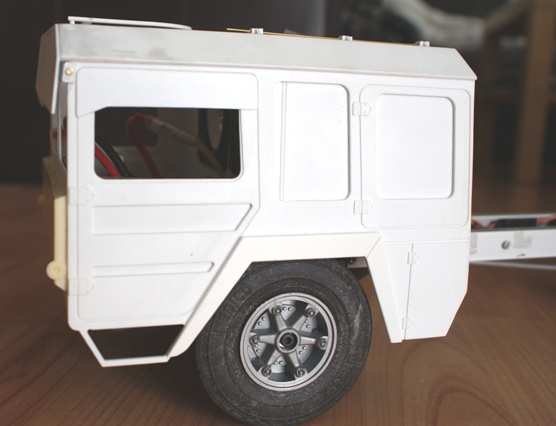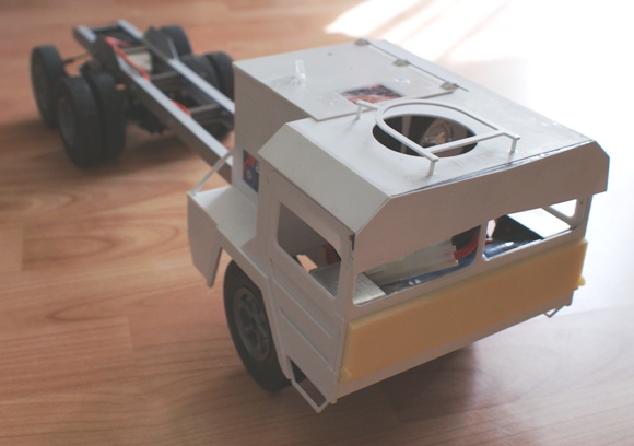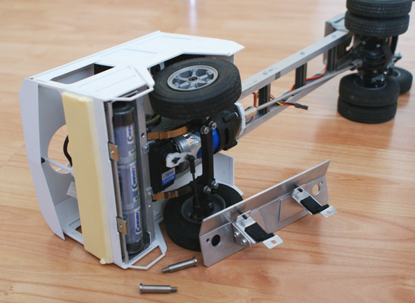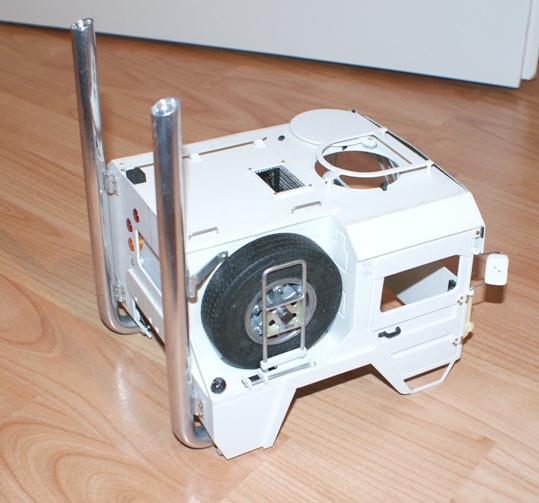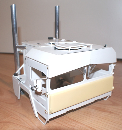 Es ist mir gelungen, den LKW rohbaufertig zu bekommen. An die Innenfront der Kabine habe ich zwei PS-Plättchen mit umgedrehten M4 Inbusschrauben geklebt, diese greifen in zwei schlichte Löcher im Akkuhalter ein und stützen die Kabine vorn.