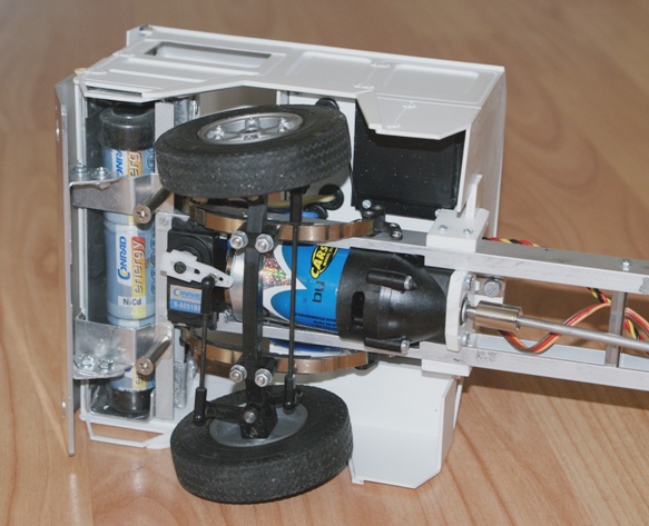 Endlich kann das Papp-Provisorium in die Tonne. Ein vernünftiger schraubbarer Träger hält das Häuschen in Position. In der Mitte der Antennenhalter, im Moment ist noch 40 MHz Technik verbaut, ob sich ein 2,4 Gig Empfänger lohnt hab ich noch nicht entschieden. Endlich nach innen verlegt wurde das Servokabel für die Lenkung.