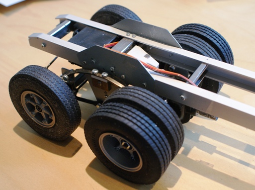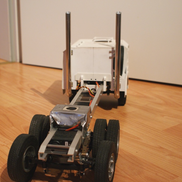 Die Geschwindigkeit ist mir beim Indoor-Test etwas hoch, die Traktion auf Laminat lausig, ein Burnout ist ohne weiteres drin. Die Dosierbarkeit ist gut, der 3,4 kHz Regler und der 5-Pol Motor fahren sich fluffig. Wenn der LKW im Außeneinsatz auch zu langsam und schlapp sein sollte, kommt ein günstiger Truckpuller rein.