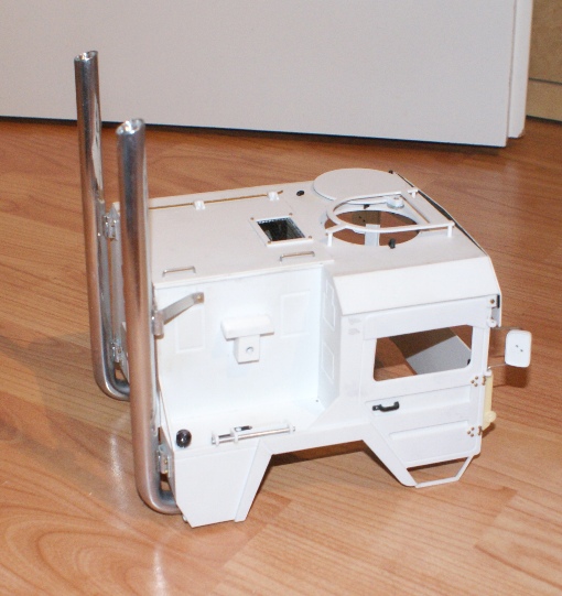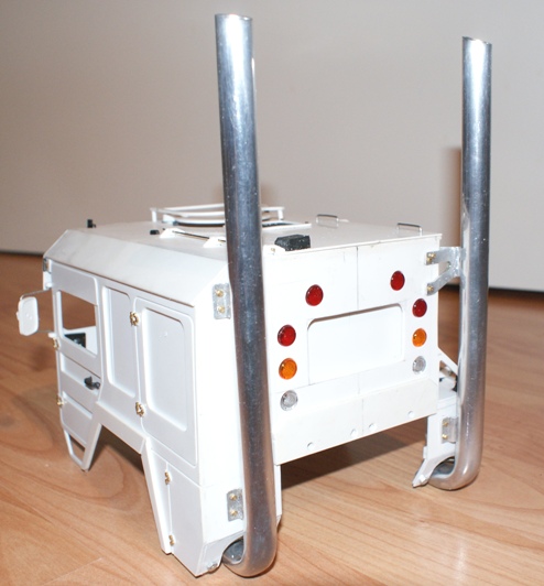Viel Arbeit auf Arbeit, daher geht es, wie sonst aber auch, nur langsam voran. Als letzten großen mechanischen Punkt am Fahrerhaus hatte ich hochgezogene Auspuffrohre auf der Liste. Waren die Rohre am Anfang der Original-Entwicklung nur dazu gut, die anderen Verkehrsteilnehmer und den eigenen Lastzug nicht mit Dieselabgasschwaden einzunebeln, so entwickelten sich die Rohre insbesondere in den Staaten zu Dekorelementen und Statussymbolen, "Highpipes" und "Stacks" genannt. Wer heute die längsten und dicksten hat, ist in. Groteske 10 Zoll Durchmesser sind keine Einzelfälle mehr. Klar, sowas brauchte ich auch.