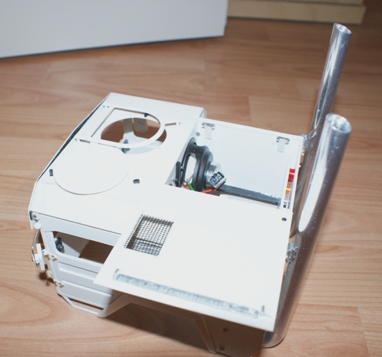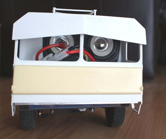 So sieht der Rohbau aus. Das Lenkservokabel geht außen an der Fassade entlang, die Empfängerantenne steckt oben unterm MG-Ring (ach dafür isser gut) und die Sonnenschuten sind nur Pappe. Das wird schon, erstmal richtig ausprobieren! -- Isch ´abe ga´ keine Fahrrad!