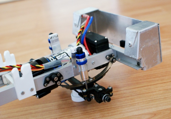 Oben der zweite Durchgang, ein brushless-Motor Robbe Roxxy 2827-26 kam zum Einsatz. In dieser Größenklasse haben die Motoren 3,17 mm Motorwellen, sind also leicht gegen 540er Motoren austauschbar. Aber können die Winzlinge auch dieselbe Leistung bringen? Ja sogar mehr. Angesteuert wird der Motor über einen (im Bild für den Versuch lose baumelnden) cs-micro-rocket der Firma cs-electronic.