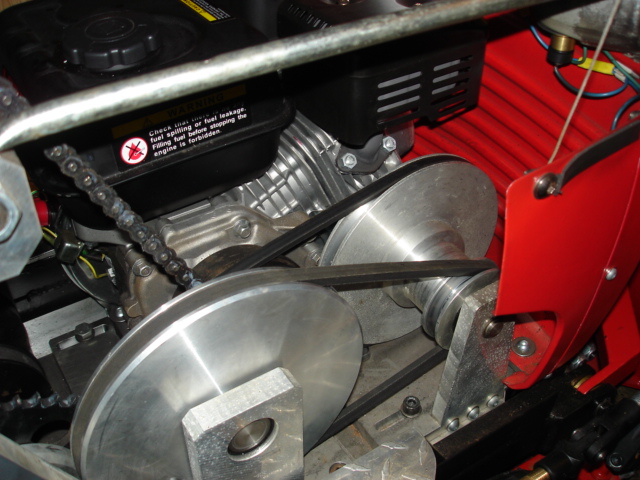 Vom Motor aus geht´s mit einer Fliehkraftkupplung auf eine erste Untersetzung (Keilriemen), dann auf einen Rollenkettenantrieb der in Form einer 8 zwei übereinander angeordnete Wellen in gegensätzliche Drehrichtung versetzt. Von jeder dieser Wellen gehen zwei locker gelegte Keilriemen in Richtung Endantrieb.