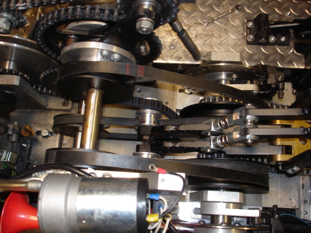 Auf diesem Bild sind die zwei übereinanderliegenden Wellen und die Spannrollen die mit den Steuerhebeln betätigt werden zu sehen.