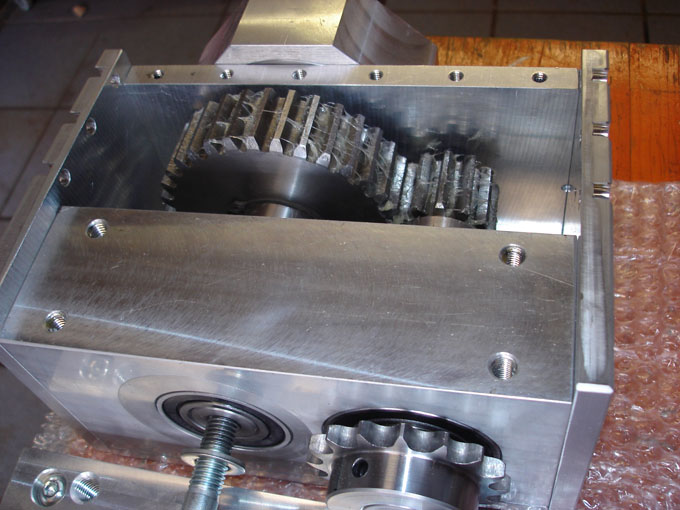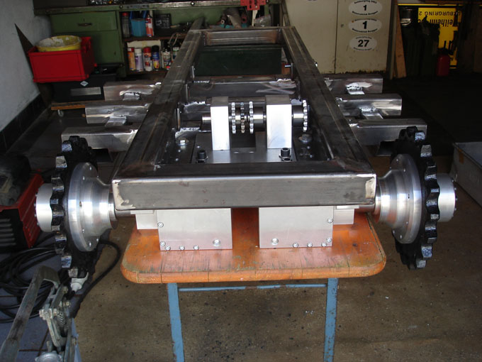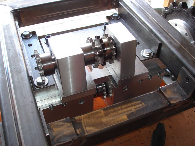 Auf diesem Bild sieht man die Rollenketten und die Umlenklagerböcke die die Ketten um die Ecke nach unten zu den Seitenvorgelegen führen.