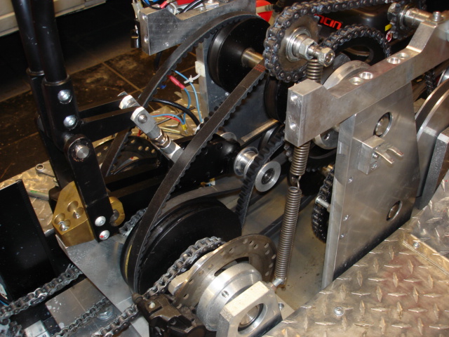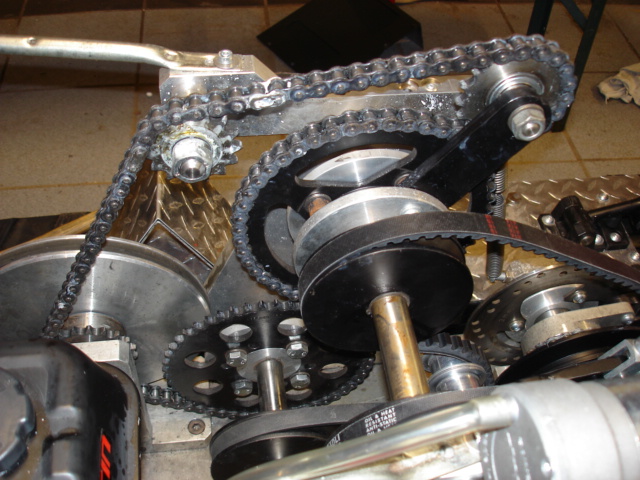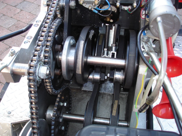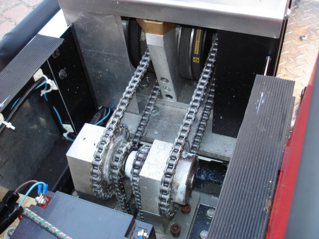 Von hier aus geht der Antriebsstrang wieder auf eine Rollenkette da das anliegende Drehmoment schon relativ hoch ist. Die angebauten Bremsscheiben ermöglichen, zusätzlich zur Steuerung über die Hebel, jede Seite einzeln abzubremsen.