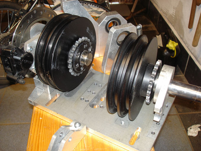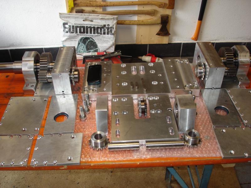 Hier sieht man das Verteilergetriebe in seinen Einzelteilen. Die beiden Riemenscheiben haben einen Durchmesser von 200mm und sind aus Stahl Vollmaterial um eine gewisse Schwungmasse zu haben.