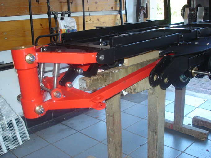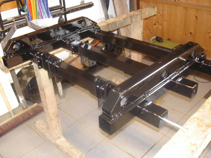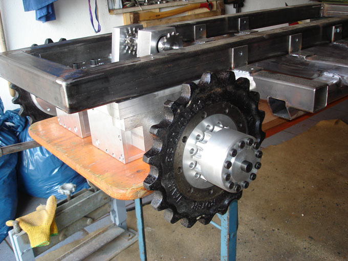 Das ist der Unterrahmen der das Fahrwerk trägt. Er liegt hier auf dem Kopf und wird mit dem Oberrahmen verschraubt. Die drei Bohrungen in dem Oberen Rohr sind die Achsaufnahmen für die Laufrollenpaare. Leider ist das Foto wegen den Spiegelungen nicht so gut...