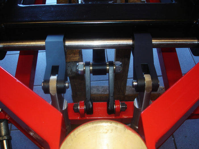 Auf diesem Foto ist der Hebel (Bildmitte) von vorne zu sehen. Die beiden Laschen stellen die Verbindung zum Unterlenker her. Die beiden Hebel links und rechts sind für die Kraftübertragung des Handhebels zuständig.