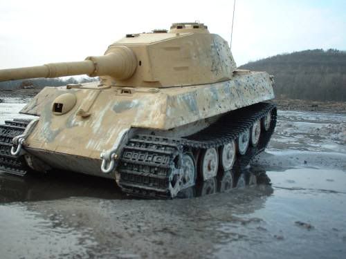 Hallo Dominik.Bei den ersten Ausfahrten, die ich in Berlin mit gemacht habe, wurden die Modelle, vorwiegend Tamiya T1 und T2, durch tiefe Pfützen und Schlamm gefahren. Teilweise kurzzeitig bis zu dem Laufrollenoberkanten. Stecken geblieben ist keiner so richtig. Teilweise ging es eben nur in der eigenen Fahrspur rückwärts wieder heraus. An Schäden waren abgefallene Laufrollen und Kettenrisse sowie eine zerlegtes Leitrad am KöTi zu beklagen. So etwas kommt aber (seltener) auch auf optimalem Untergrund vor. Mein Maus-Eigenbau ist bis fast zur Wannenoberkante wasserdicht. In Finow habe ich das Modell in festem Waldboden-Schlamm und -Schlick entsprechend versenkt. Dabei sind mir Schwingarme umgeschlagen und der Antrieb ging durch Überlastung kaputt, was aber eher an Konstruktions- und Ausführungsmängeln meinerseits lag.Zusammenfassend kann man sagen: Der Betrieb im Schlamm ist genau so möglich wie auf trockenem Boden. Steine, die einem ins Laufwerk geraten und die Ketten blockieren, sowie Auf- und Ablaufen der Ketten sind aber doch öfters möglich. Weil man eben nicht sieht, was los ist. Es ist besonders viel Feingefühl gefragt. Wer vom Fahrbild her sieht "es stimmt was nicht" und zum Dank mehr Gas gibt, kriegt unter allen Umständen jedes Modell zum Stehen oder gar kaputt.
