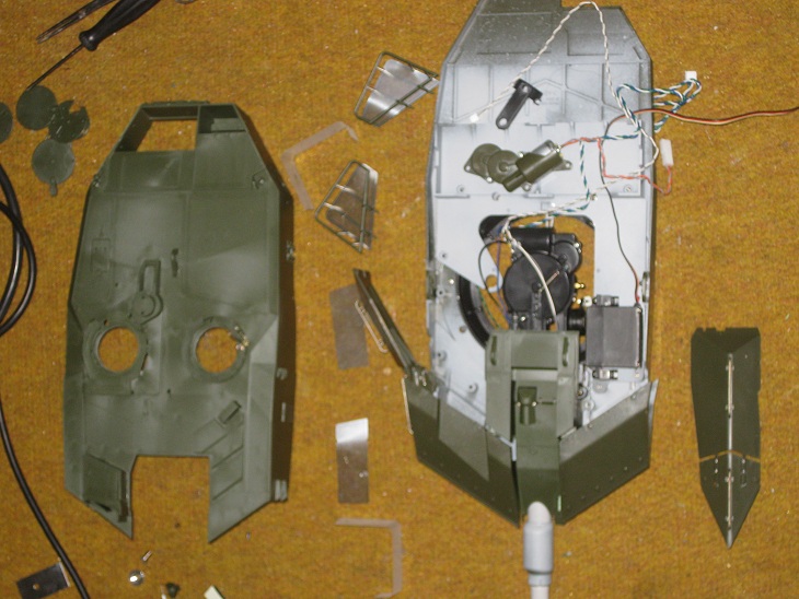 Die Oberteile der Turm- Frontpanzerung, Geschützlager etc... sind alle nur aufgelegt, noch nicht verschraubt! Ich möchte immer den Aufwand von Montage und Demontage für Installation Elektrik und Lack so gering wie möglich halten.