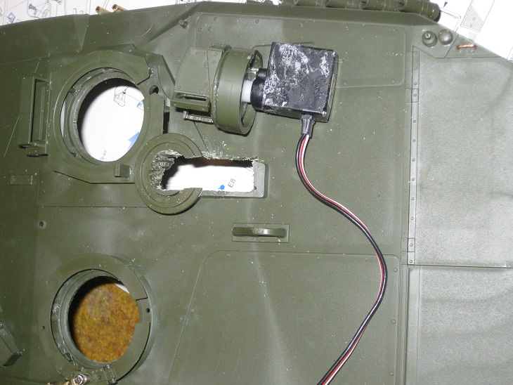 Das Peri "schreit" danach beweglich gemacht zu werden (ok, ist hier nicht das erste....). So hab ich ein Miniservo in den ausgeschnittenen Turm gesetzt. Das Servo in dieser Größe muß "hoch" da sonst der Akkupack nicht mehr drunterpasst!