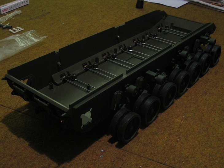 Ich beginne immer mit den Laufrollen- aus den Gießästen entfernen, entgraten, auf die Rollen der äusseren Seite die Naben geklebt und wichtig- vor Montage der Gummibandagen lackieren! Nach dem lackieren montiere ich dann die kompletten Rollen mit "ordentlich Fett" unter den Messingbuchsen.