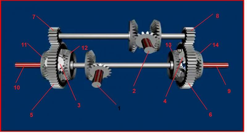 Wenn nur der Fahrantrieb 1 in Betrieb ist, bleiben die Zahnräder 5/6 stehen (gehämt durch das Lenkgetriebe). Es drehen sich nur die Diff. 11/12 u 13/14 mit der Abtriebswelle. Dreht sich jetzt der Lenkantrieb, werden die beiden Zahnräder 5/6 in Gegenrichtung gedreht. Auf zb. der linken Seite in Fahrtrichtung auf der Rechten gegen Fahrtrichtung. Somit dreht die l Seite schneller die r langsamer. Die Drehzahl des jetzt in Gegenrichtung laufenden Zahnrad 6 frisst einen teil der Antriebsdrehzahl auf, weil diese Seite jetzt eine umlaufende Gegendrehung des Diff. erhält. Auf der Gegenseite wird sie Dazuaddiert.