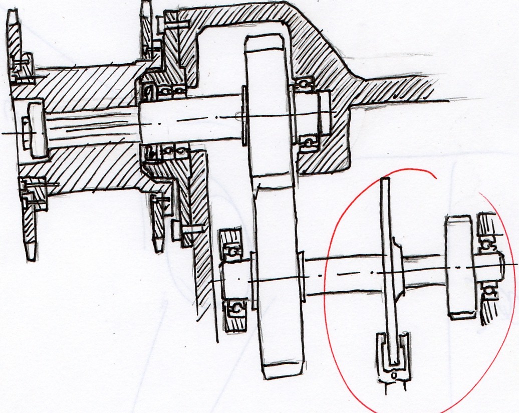 Im Anschluß geht es gleich ins Lenkgetriebe, dann noch über die skizzierte Welle mit der Bremsscheibe, und Schon bin ich am Zahnritzel angelangt.