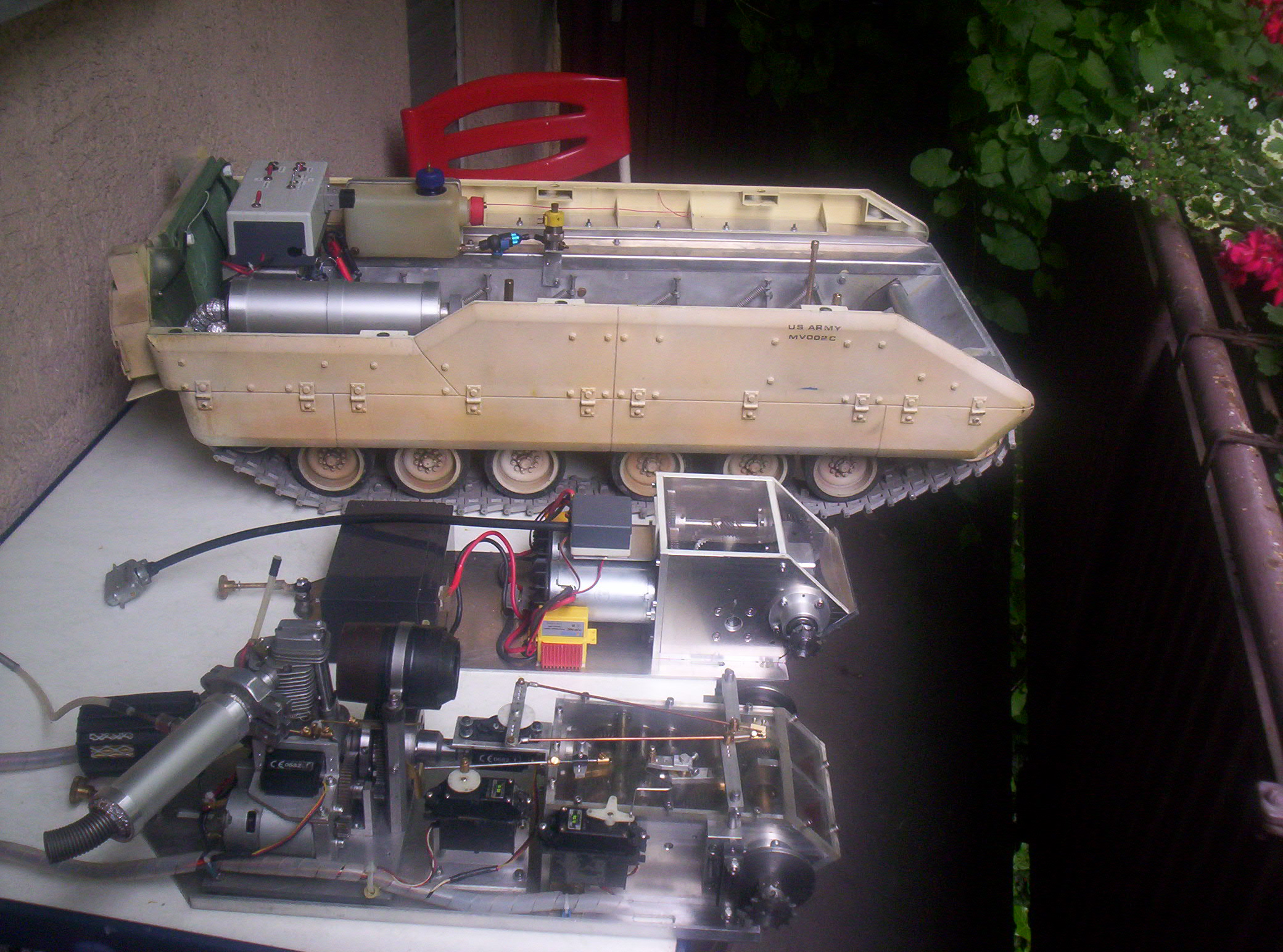 ehrliche Meinung? Das Ding ist viel zu klein! Du willst da 'nen 12-Zyl. da reinwuppen. dazu noch hochkomplexe Wandlergetriebe, Hydraulik, die ganze Elektronik mit Kameras, Batterien, etc. Und alles in einen 80cm-Panzer? Mit allen Hydraulikzylindern, Steuerblöcken, etc?