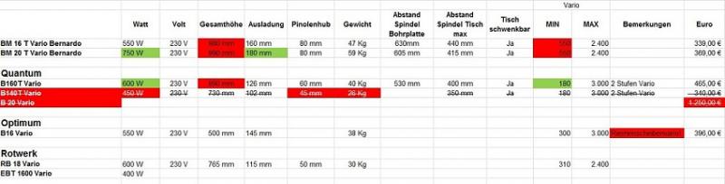 Ich bin für weitere Tips / Erfahrungswerte dankbar, suche eine Richtung 1m hohe Tischbohrmaschine, >700W / 230V und wenn mgl. eine Vario.