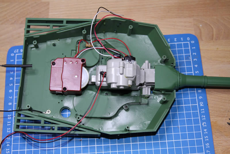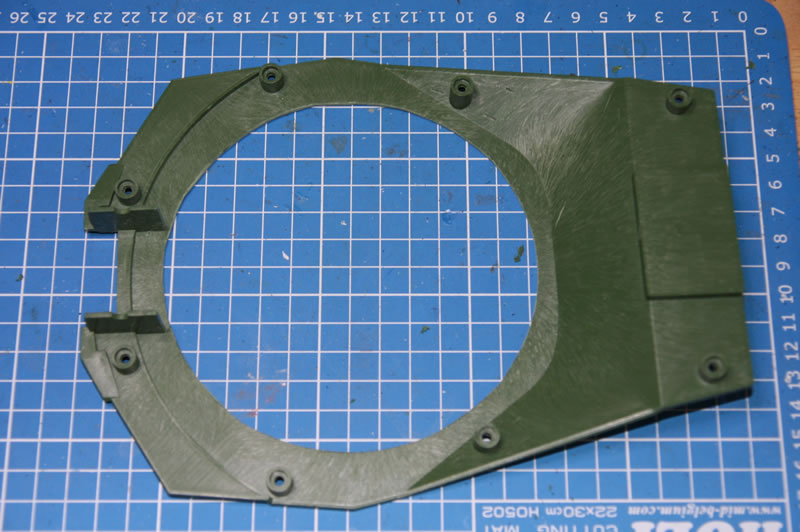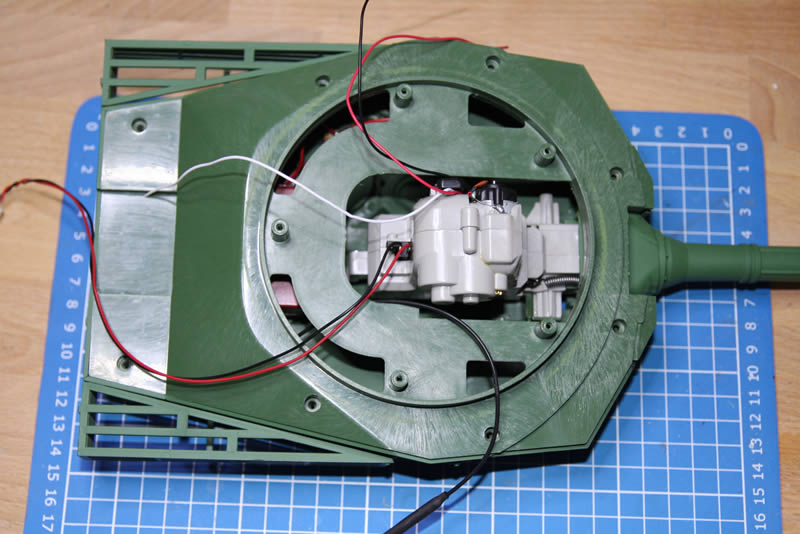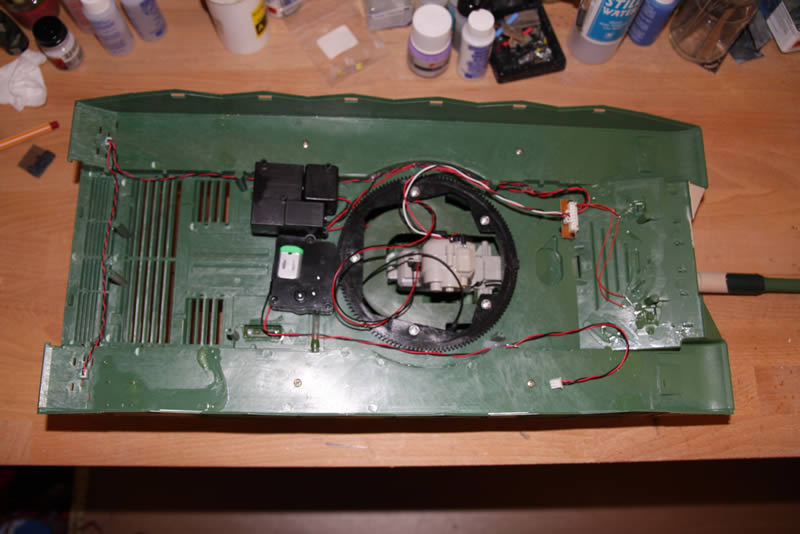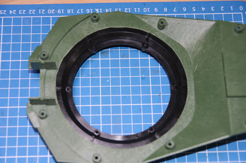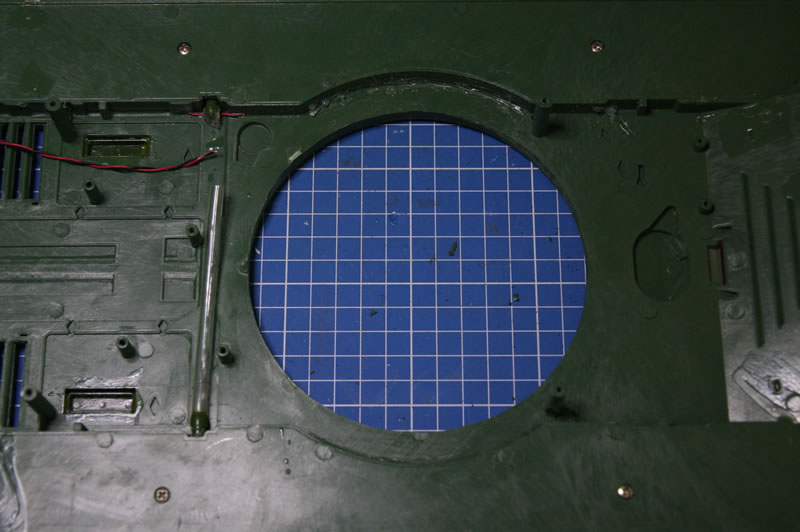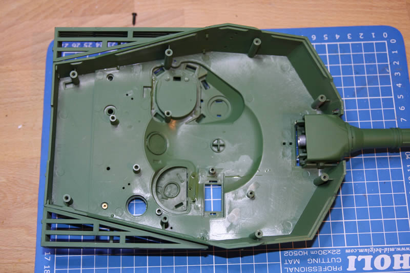 Blick auf die Unterseite des Turms, der Drehkranz ist schon runter. Geplant ist der Leo2-Drehkranz von Tamiya, der mir schon in meinem M1 sehr gut gefällt.