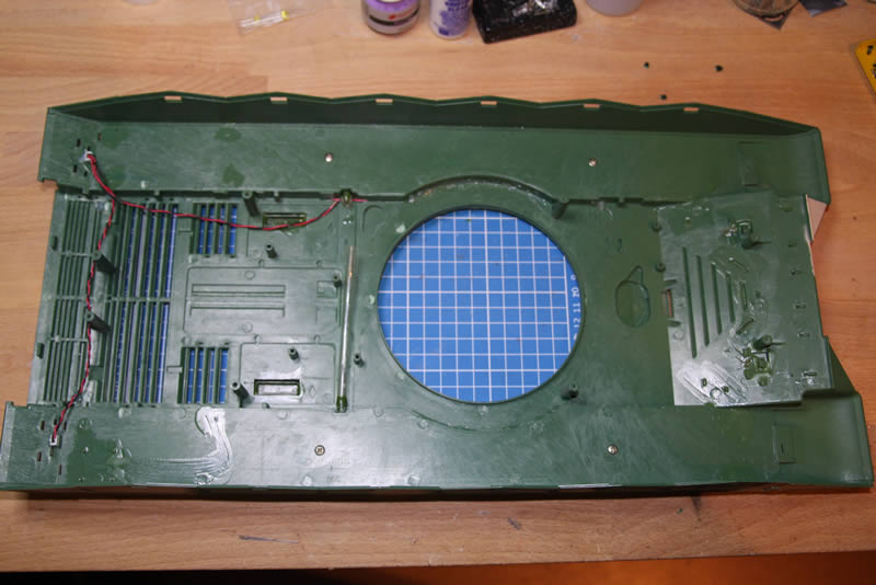 Danach habe ich mich der Oberwanne zugewandt. Hier sollte ja der Drehkranz vom Tamiya-Leo2 rein. Also erst mal mit der Laubsäge das Loch vergrößern.