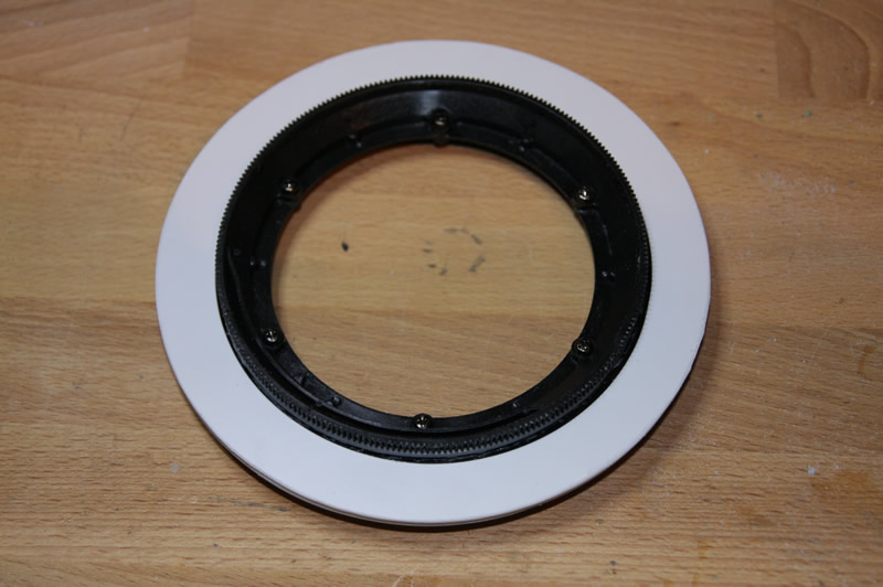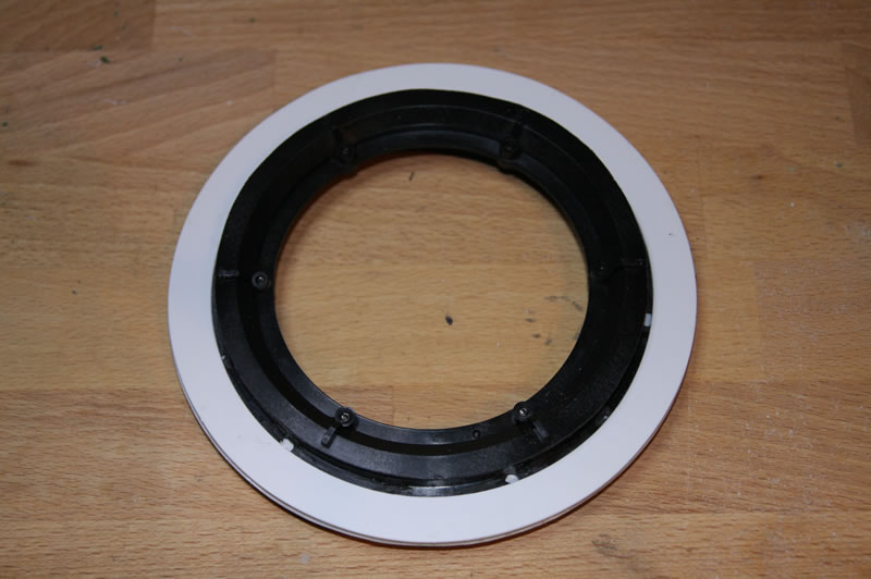 heute war Drehkranzgroßkampftag. Folgendes ist dabei herausgekommen. Zunächst wurden mit einem Messerzirkel (anders kann ich das Teil nicht beschreiben) drei gleich große Scheiben aus Poly geschnitten. Anschließend verschiedene Innendurchmesser heraustrennen. Der Drehkranz wurdd dann wie ein Sandwich da eingepackt. Mit dem guten Ruderer-Kleber hält das jetzt auch bombenfest. Hier einmal von oben und von unten.