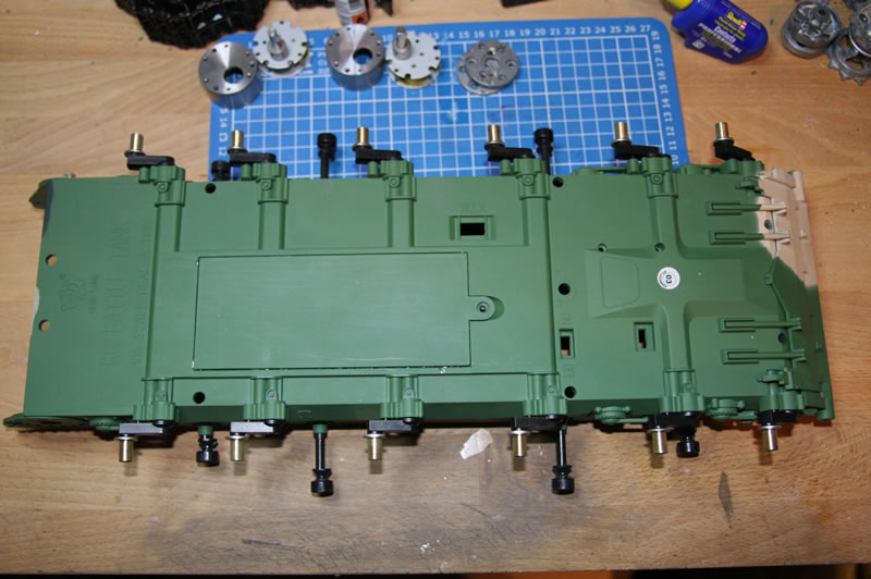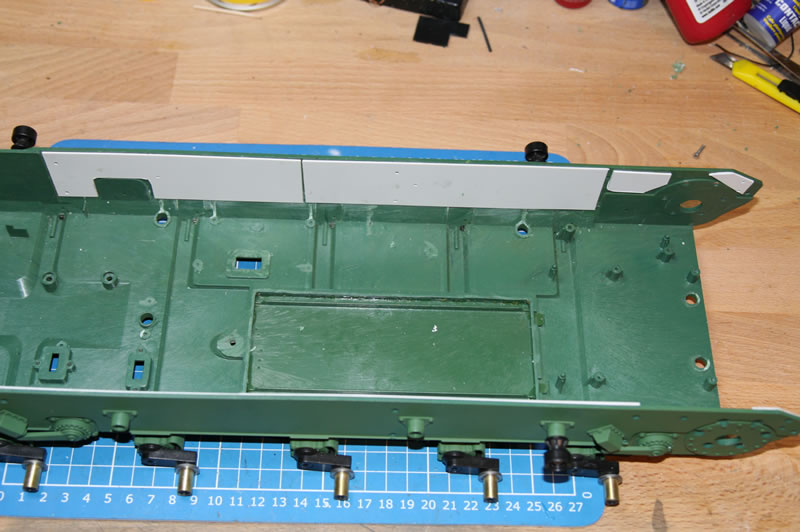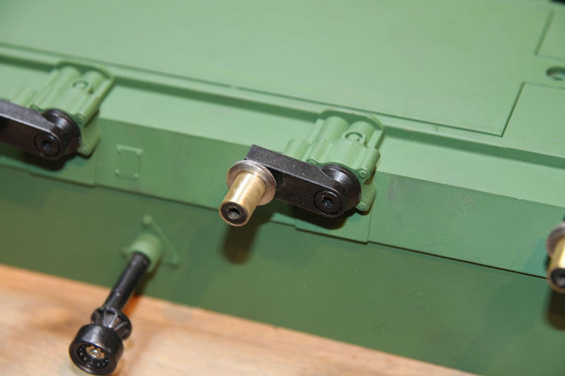 Durch entsprechende Bohrungen wurde das Ganze dann verschraubt. Sieht jetzt vielleicht etwas grobschlächtiug aus, dochj das stört mich weniger. Erstens wird das noch überlackiert, und zweitens verschwinden viele der Schraubenköpfe hinter den Seitenschürzen, Lauf- und Antriebsrollen.